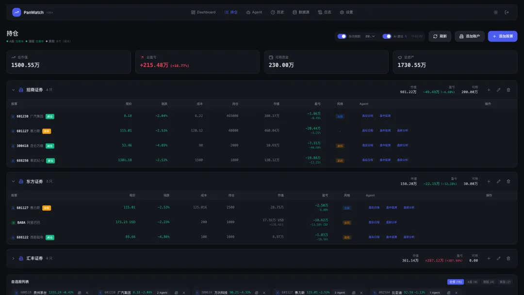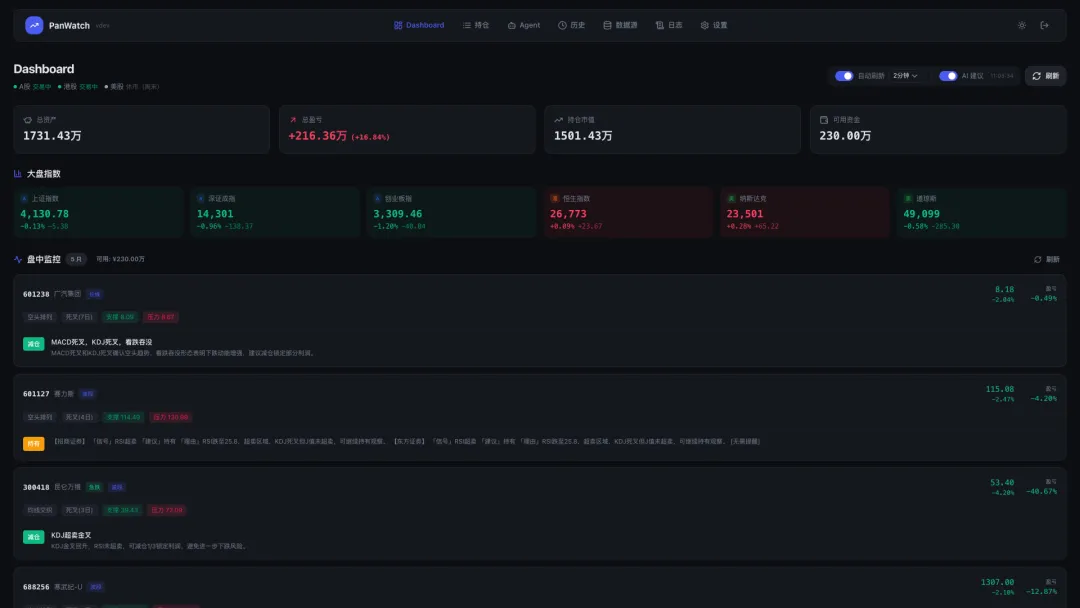 如果 daily_stock_analysis 是"每日报告型",PanWatch 就是"实时监控型"——24 小时帮你盯着,价格异常立刻通知。