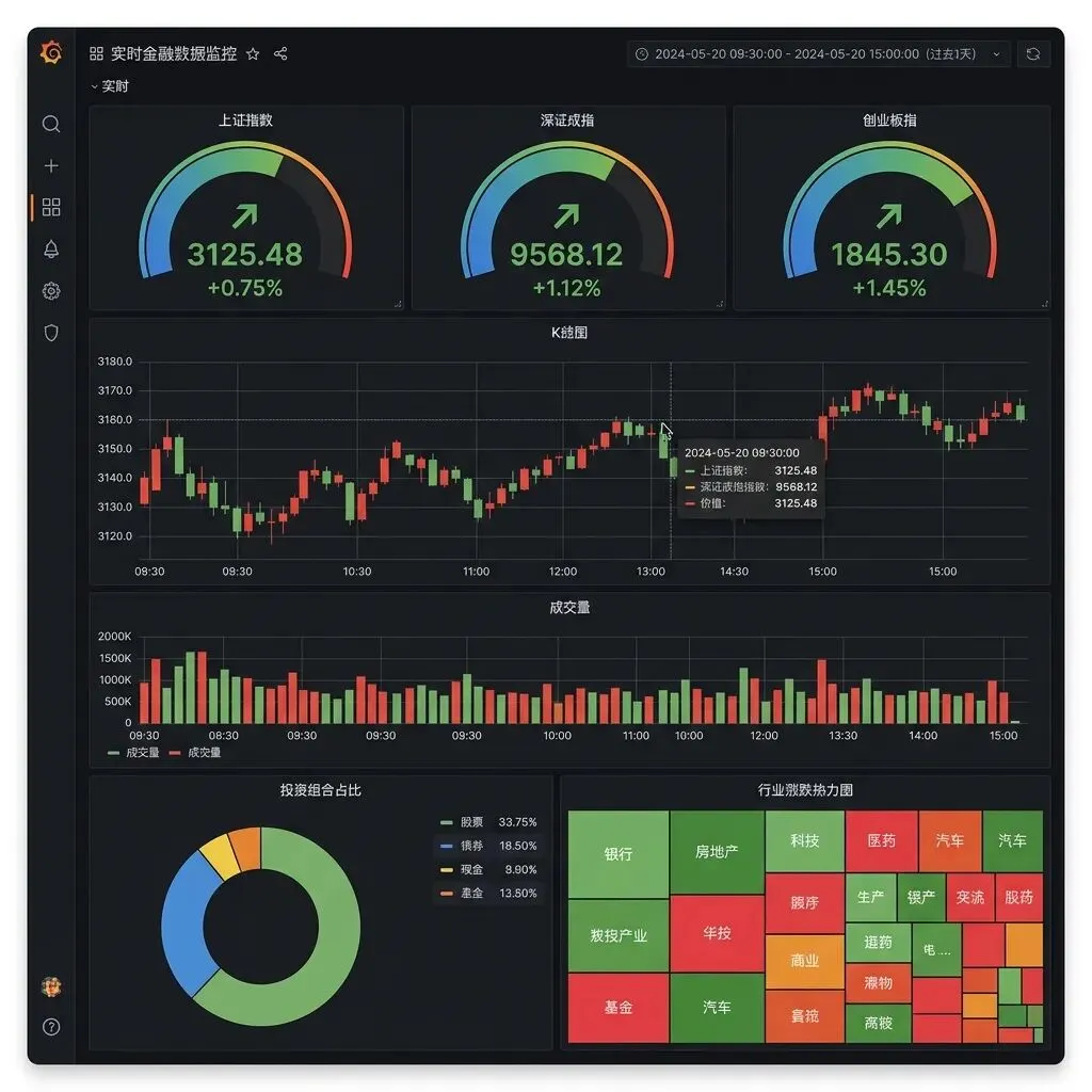 然后用 Python + AKShare 写个定时脚本,每隔 5 秒往 InfluxDB 里写入最新行情数据,Grafana 自动刷新。