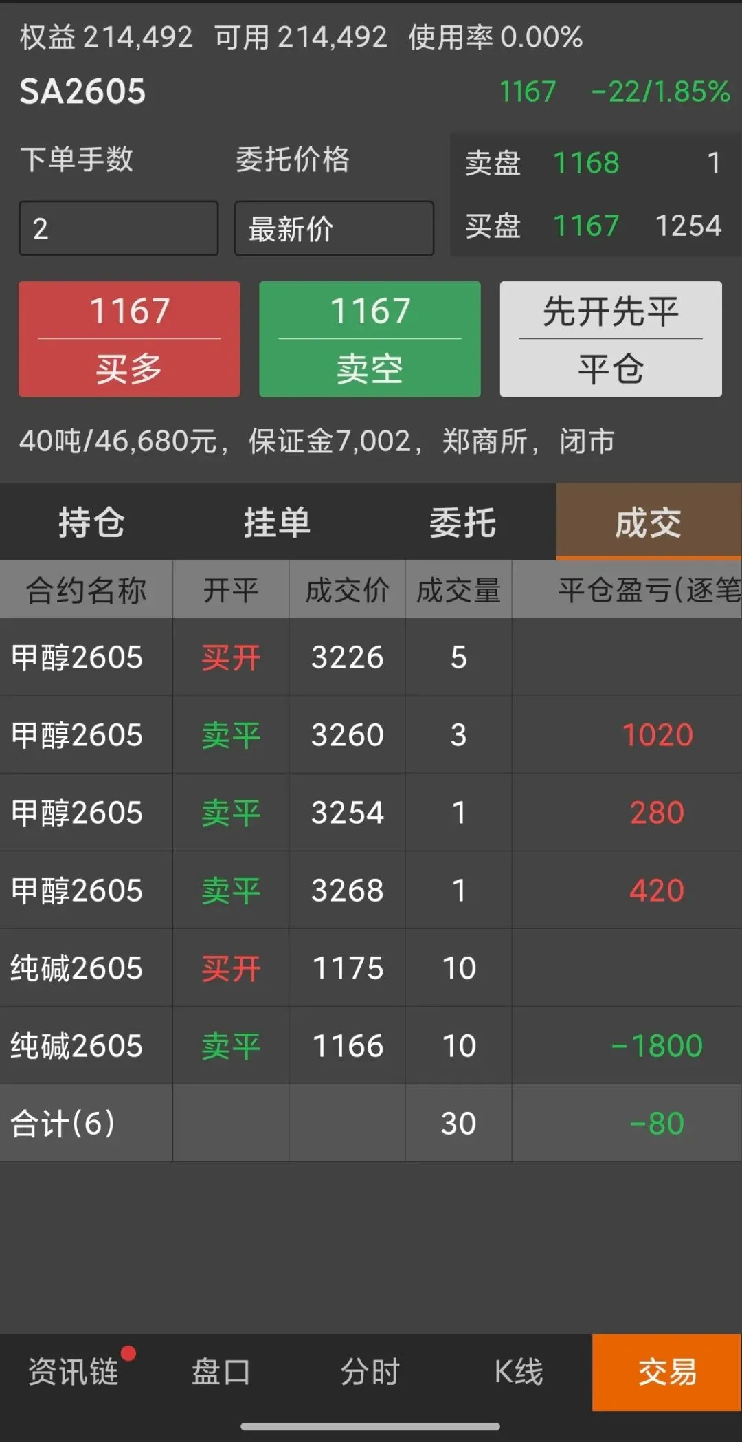 甲醇经过两天的回调,夜盘低开后逐渐企稳,于是入场开了16手多单,结果只成交了5手。5手就5手吧,总好过没有。这笔交易走得还挺流畅,进场没多久就拉升了,我逐步平仓,结果又卖飞了。但不管怎样,按自己的交易体系操作没有错,虽然赚少了,也有三十多个点的利润,知足常乐。