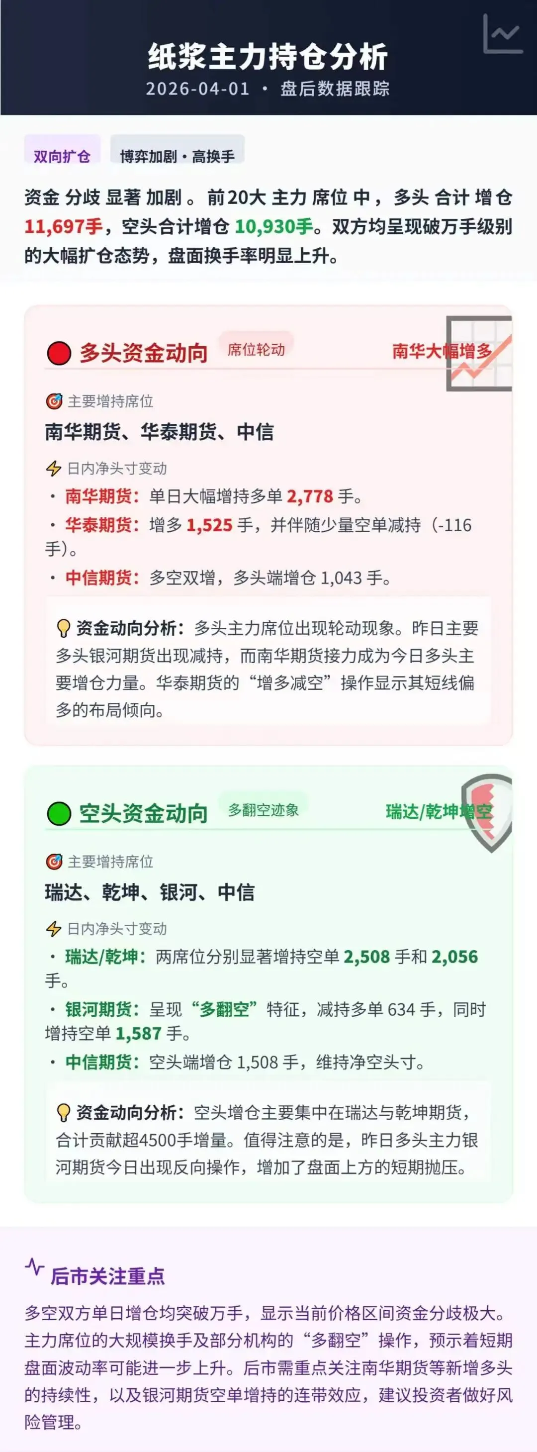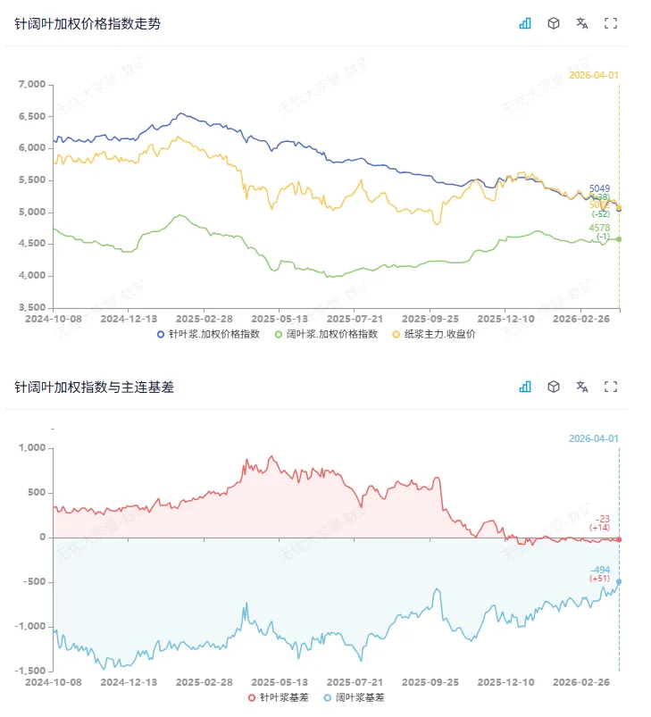 市场摘要:今日纸浆SP05合约震荡下行,针叶银星现货报价05+30附近,阔叶桉木报价4620附近,针叶刚需点价成交,阔叶实单实谈。期货端双方均呈现破万手级别的大幅扩仓态势,盘面换手率明显上升。