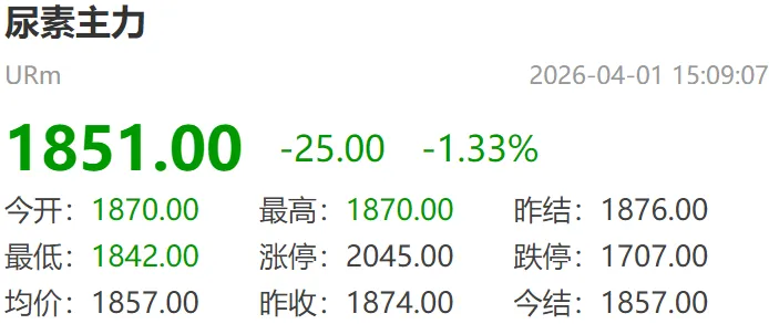 期货方面:4月1日郑商所尿素期货主力开盘1870元/吨,收盘1851元/吨,结算1857元/吨,较上一交易日下跌25元/吨。