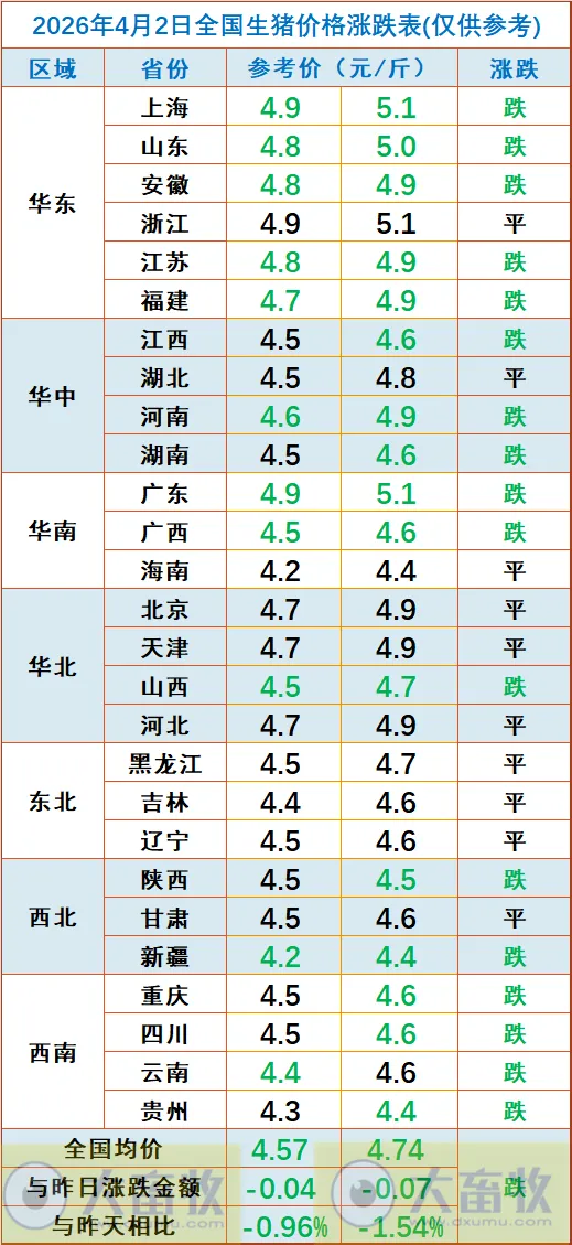 大畜牧小编根据我国27省的猪价数据,计算出2026年4月2日全国平均猪价为每斤4.66元,比昨天下跌0.05元,跌幅为1.25%,跌幅扩大,且再次创新低;