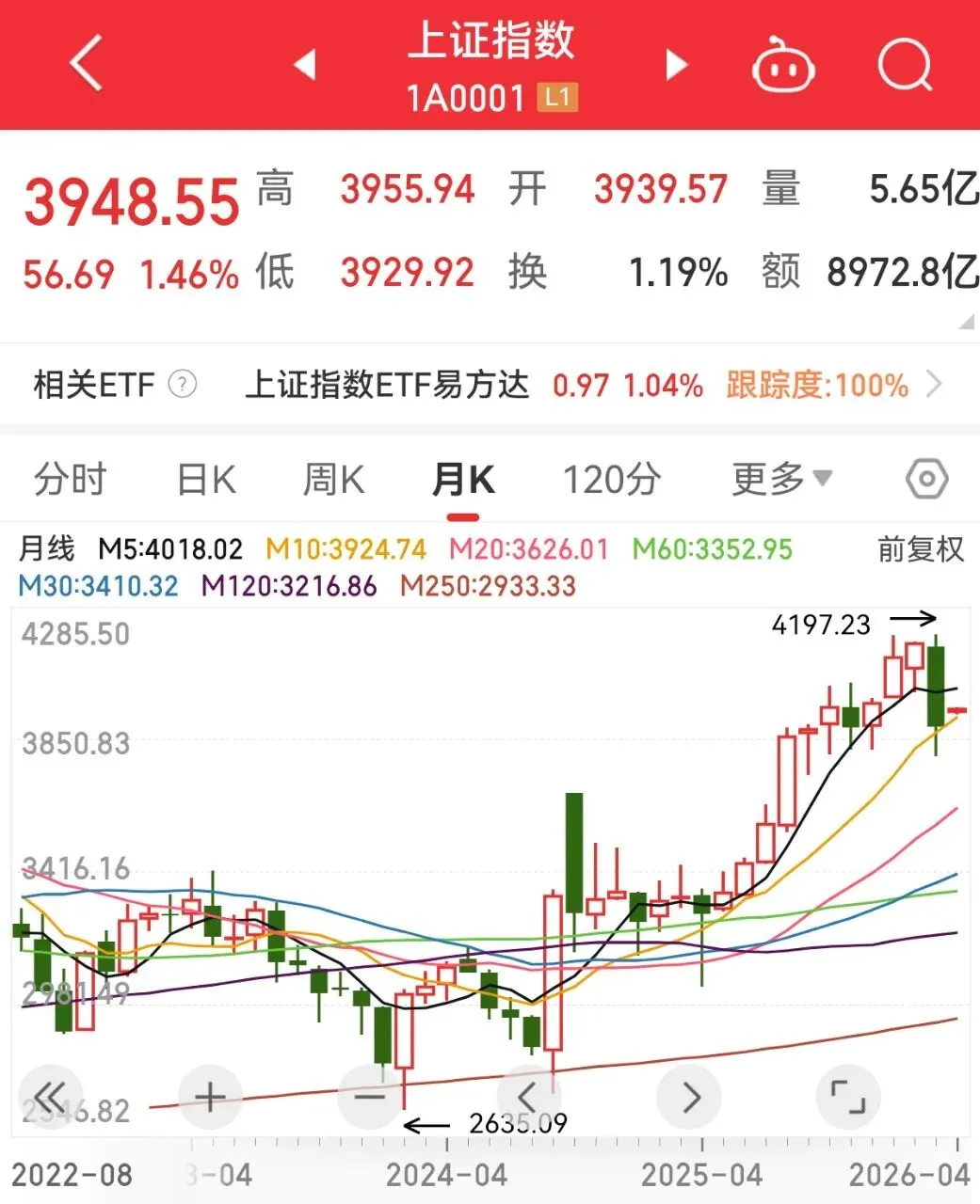 月线不能有效跌破十月均线,目前10月均线在3924点,牛市首阴呀,抄底有肉。所以大概率不会跌破。