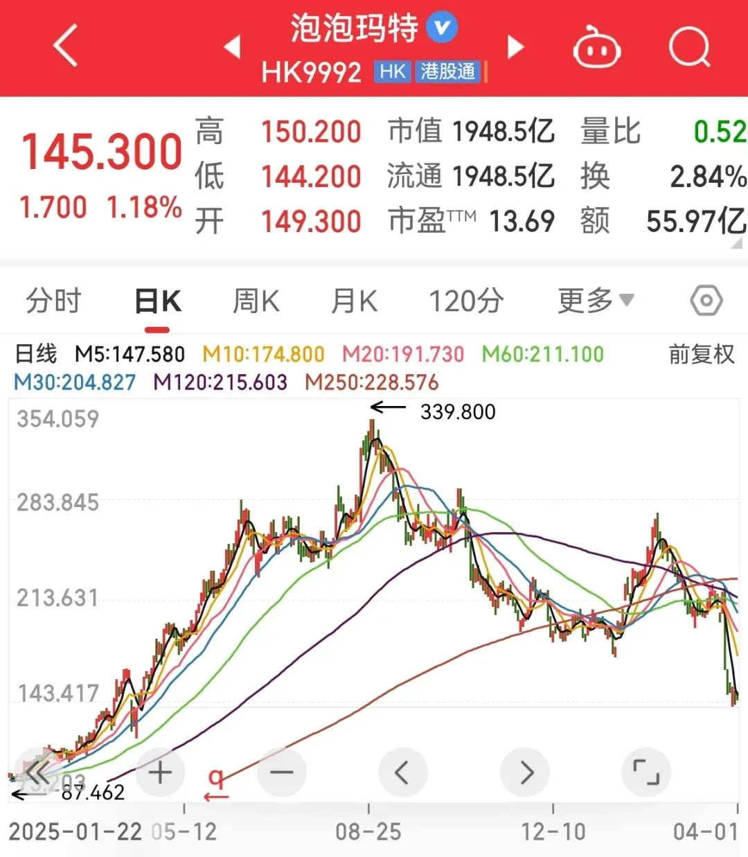 看一下泡泡玛特,最近直接从220几个交易日跌到140,账户也是因为她,今年从赚钱变成亏钱,那么现在的泡马特真的没人要了吗?
