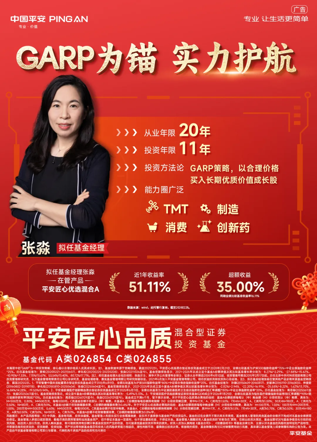 风险提示:平安匠心优选混合风险等级:R3-中风险,平安匠心品质混合风险等级:R3-中风险,基金有风险,投资须谨慎。基金管理人和股东实行业务隔离制度,股东并不直接参与基金财产的投资运作。基金的过往业绩并不预示其未来表现,基金管理人管理的其他基金的业绩并不构成对本基金业绩表现的保证。基金管理人承诺以诚实信用、勤勉尽责的原则管理和运用基金资产,但不保证本基金一定盈利,也不保证最低收益,不保证本金。基金管理人提醒投资人基金投资的“买者自负”原则,在做出投资决策后,基金运营状况与基金净值变化引致的投资风险,由投资人自行负担。投资人购买基金,既可能按其持有份额分享基金投资所产生的收益,也可能承担基金投资所带来的损失。投资人应当认真阅读《基金合同》、《招募说明书》等基金法律文件,全面认识本基金的风险收益特征和产品特性,并根据自身的投资目的、投资期限、投资经验、资产状况等判断基金是否和投资人的风险承受能力相适应,理性判断市场,谨慎做出投资决策。根据相关规定,基金销售机构可以对销售费用进行优惠,具体请以基金管理人或者销售机构的公告为准。本材料由平安基金管理有限公司提供,以上观点仅代表当时观点,今后可能发生变化,仅供参考,不构成投资建议或保证,亦不作为任何法律文件。上述产品由平安基金管理有限公司发行与管理,代销机构不承担产品的投资和兑付责任。