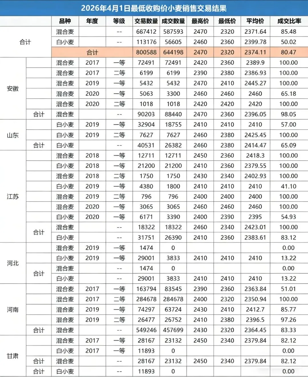 4月 1 日最低收购价小麦投放交易数据出炉:计划销售 800,588 吨,实际成交 644,198 吨,成交率 80.47%,成交均价 2,374 元 / 吨,成交区间 2,320—2,470 元 / 吨。