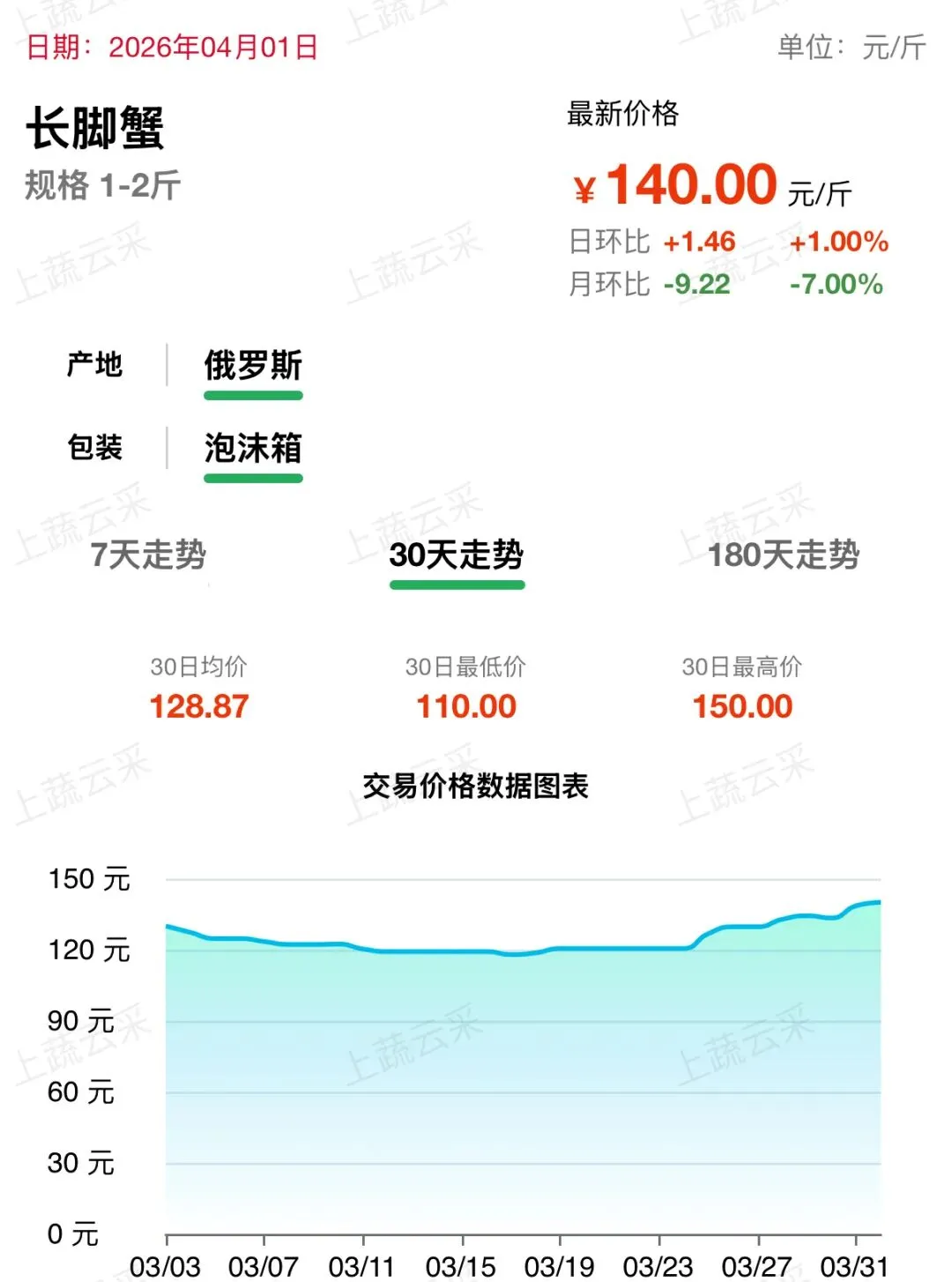俄罗斯长脚蟹受国际物流波动及季节性捕捞配额影响,近期出货量有所缩减。国内库存消耗较快,叠加清明假期备货需求带动走货,价格小幅上行。近一周呈现震荡回升走势,目前长脚蟹(1-2 斤)批发价格为 140 元 / 斤。
