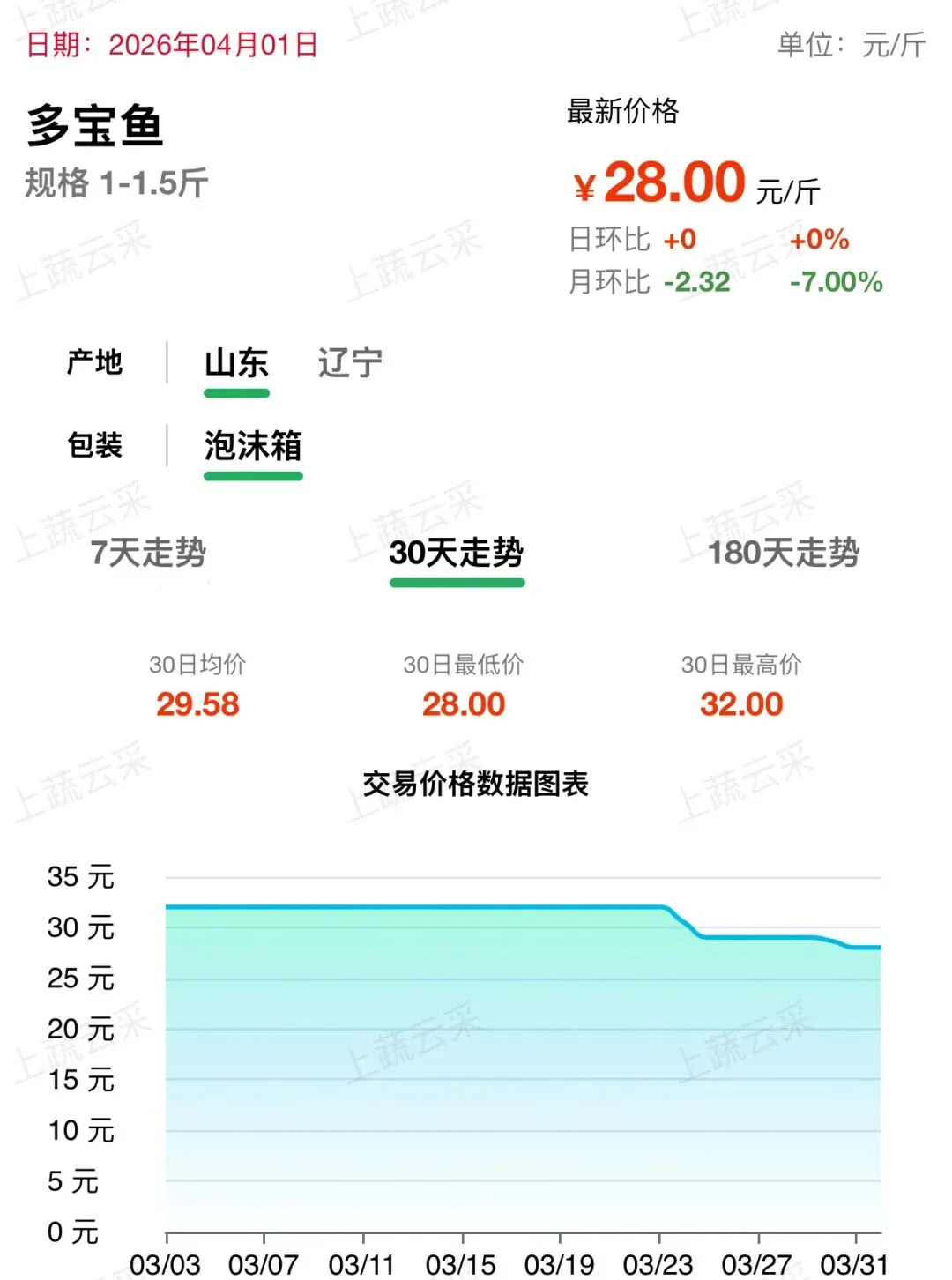 山东、辽宁产区养殖供应稳定,市场货源充足,叠加终端需求平稳,价格呈稳步回落态势。近一周维持震荡下行走势,目前多宝鱼(1-1.5 斤)批发价格为 28.00 元 / 斤。