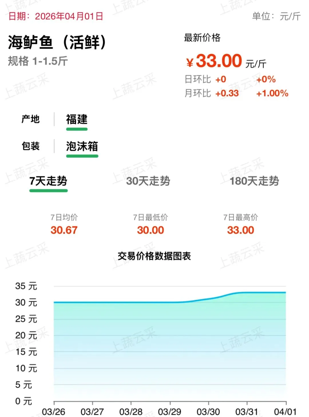 福建产区活鲜供应充足,清明假期餐饮备货需求提振,带动价格稳步上行。近一周呈现持续上涨走势,目前海鲈鱼(活鲜 1-1.5 斤)批发价格为 33.00 元 / 斤。