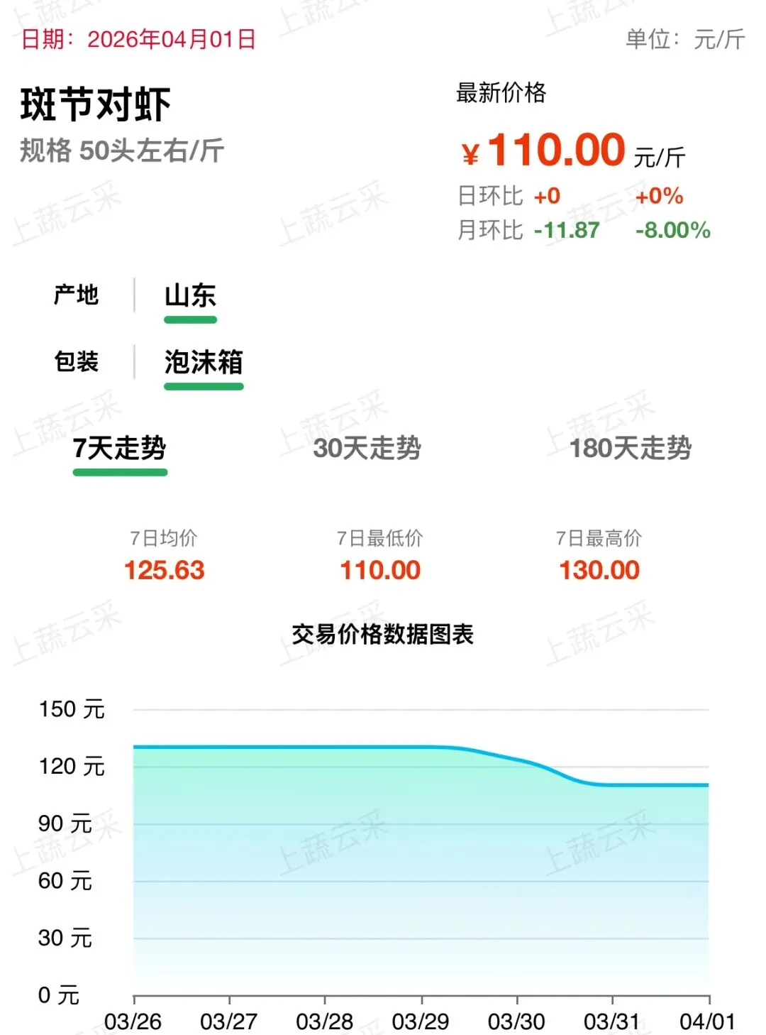 山东产区养殖供应稳定,市场货源充足,需求端无明显提振,价格持续回落。近一周呈震荡下行走势,目前斑节对虾(50 头左右 / 斤)批发价格为 110.00 元 / 斤。