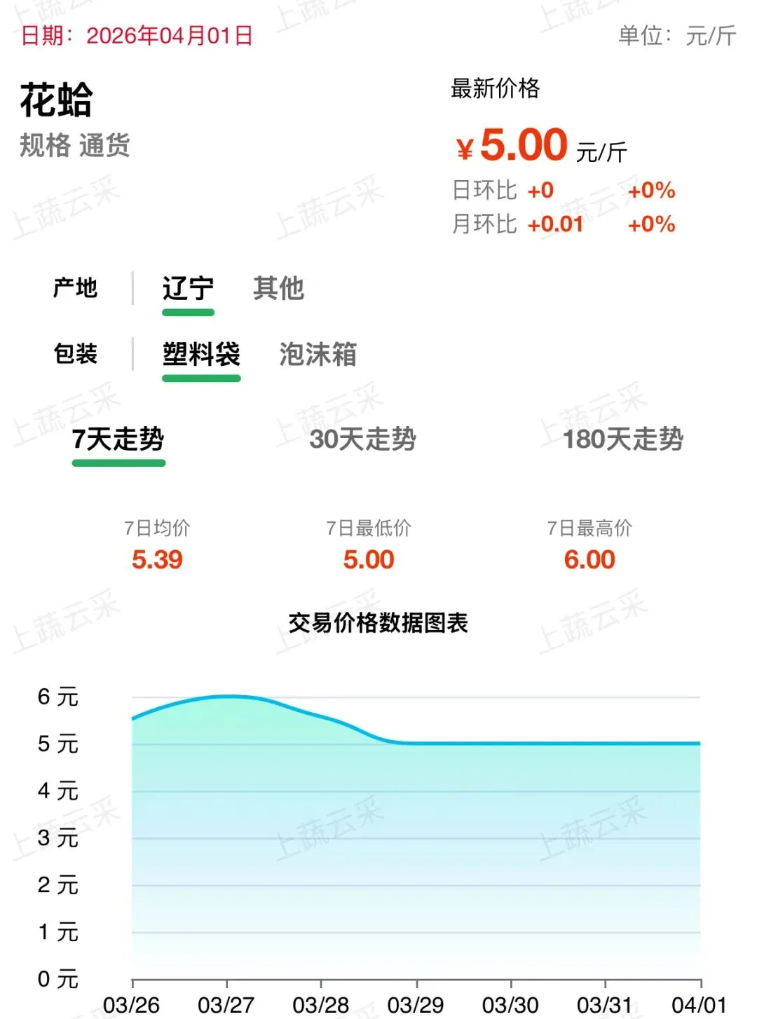 辽宁等产区供应充足,市场供需平衡,价格维持平稳运行。近一周呈先涨后稳走势,目前花蛤(通货)批发价格为 5.00 元 / 斤。