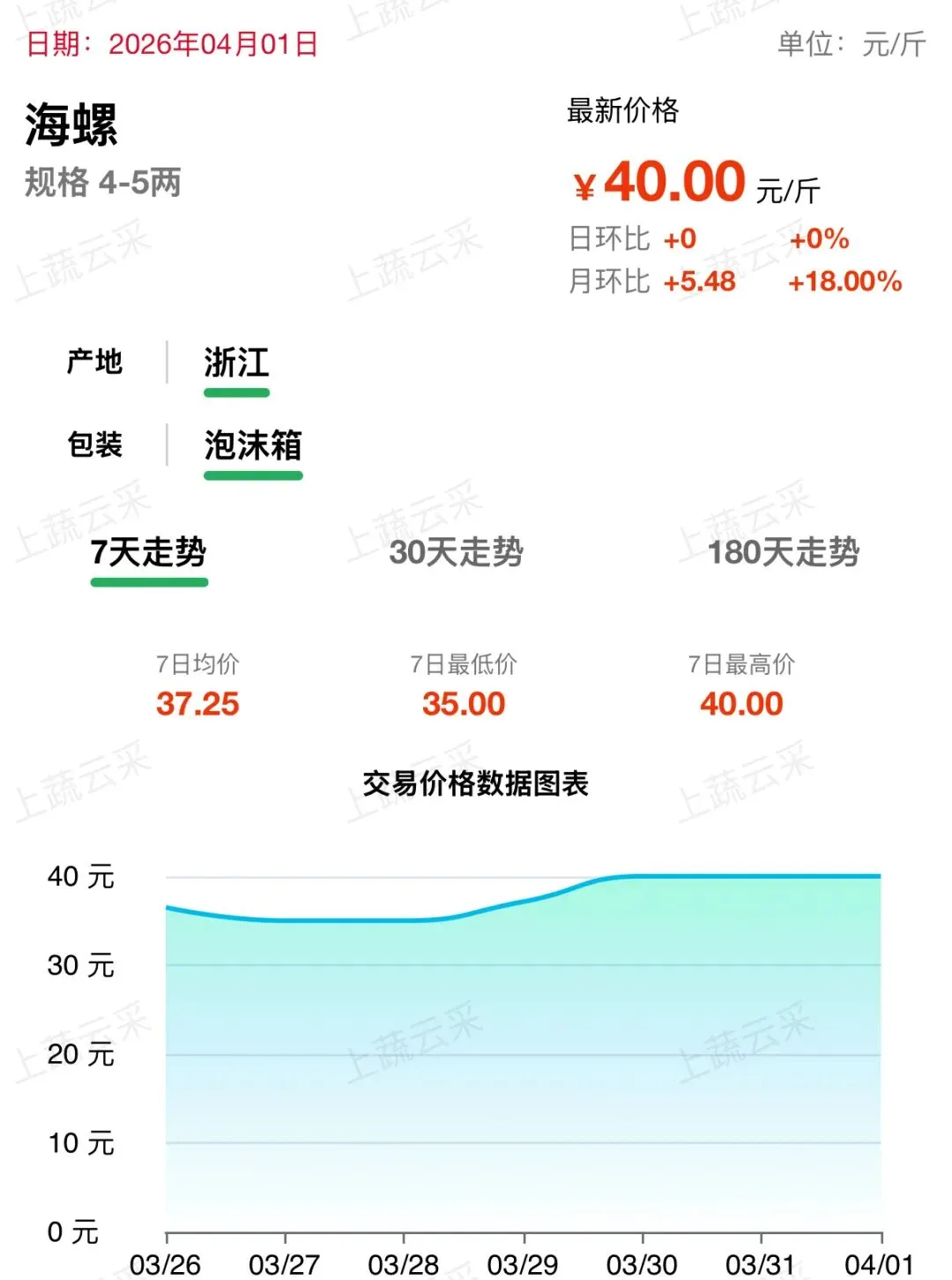浙江产区受季节性捕捞影响,货源供给收缩,市场流通量减少,带动价格持续上涨。近一周呈稳步上行走势,目前海螺(4-5 两)批发价格为 40.00 元 / 斤。