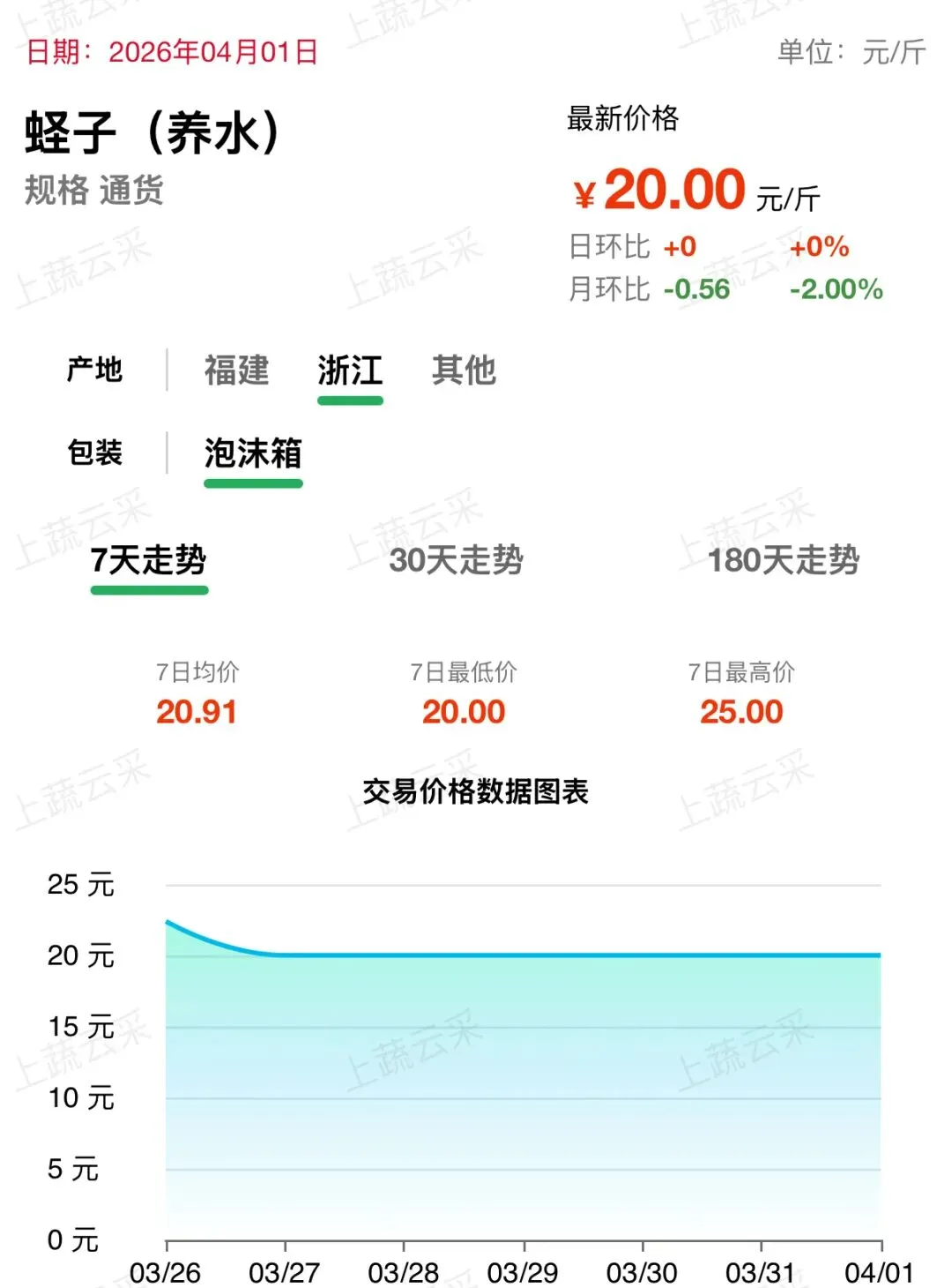 浙江、福建产区供应稳定,市场货源充足,价格小幅回落。近一周呈平稳下行走势,目前蛏子(养水通货)批发价格为 20.00 元 / 斤。