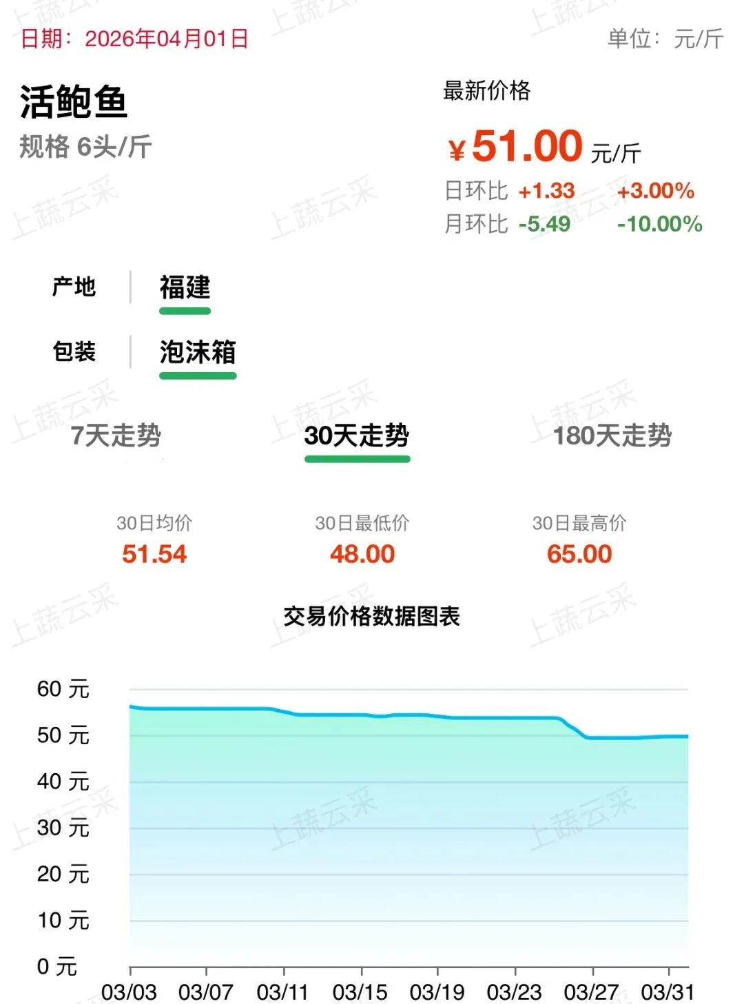 福建产区养殖供应充足,市场供需平稳,价格小幅波动。近一周呈震荡回落、小幅回升走势,目前活鲍鱼(6 头 / 斤)批发价格为 51.00 元 / 斤。