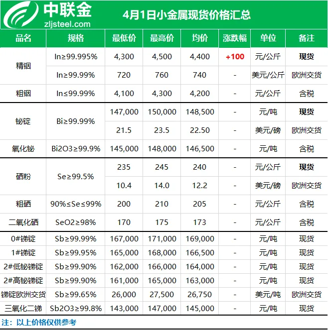 今日溧阳中联金铟价小幅上调。现货市场中,今日价格上行主要受贵金属整体行情回调带动,叠加生产厂家普遍维持挺价惜售的出货策略,对铟价形成了双重支撑;但下游终端实际需求依旧疲软,尽管价格出现小幅上行,但市场整体买兴不足,实际成交一般,供需观望情绪依旧浓厚。据中联金了解,铟现货价格报价维持在 4300-4500 元 / 公斤;粗铟价格 4100-4300 元 / 公斤;MB 英国金属导报铟报价在 720-760 美元 / 公斤之间。