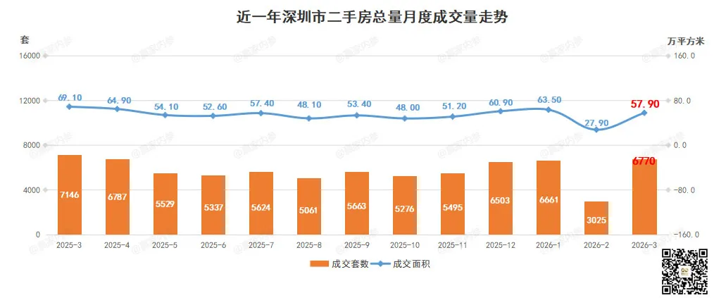 根据@赢家内参 监测,3月深圳全市二手房成交6770套,环比↑123.80%,成交面积约579425㎡,环比↑108.02%,其中住宅成交5071套,环比↑116.80%,住宅成交面积约487923㎡,环比↑113.30%。