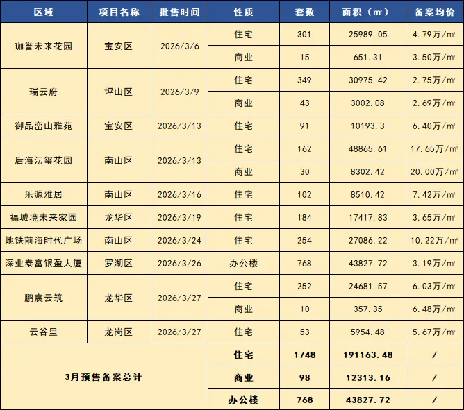 3月共10个项目获批预售,其中9个为住宅项目,住宅批售共1748套(环比↑208.833%),面积约19.11万平米(环比↑214.62%)。