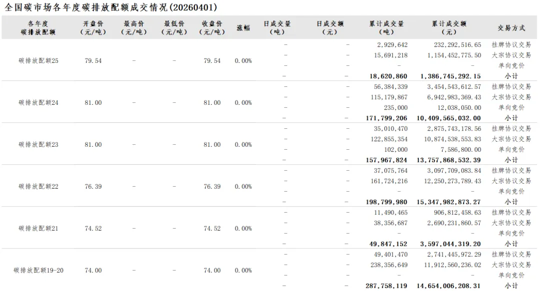 2026年1月1日至4月1日,全国碳市场碳排放配额成交量19,926,621吨,成交额1,490,594,025.75元。