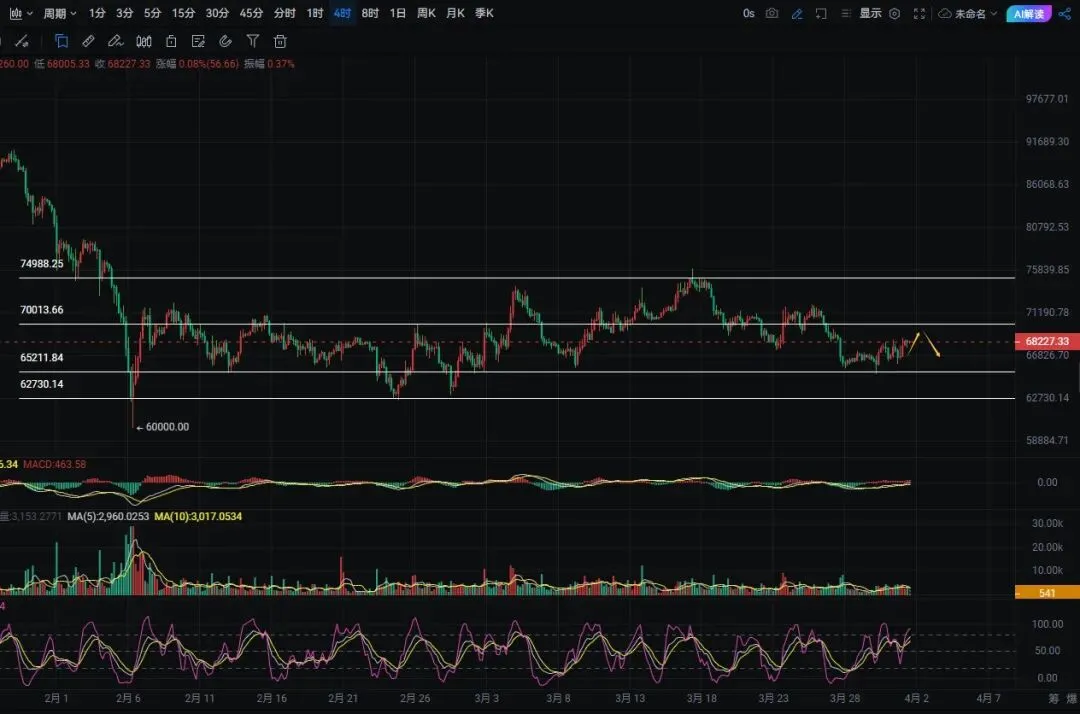 昨日发布的晚间短线区间操作已完美应验,精准预判68500关键压力与67000支撑区间,行情完全按照预判走势运行,多空双段利润悉数兑现,跟上操作的粉丝均能稳稳抓住波段收益,再次印证了盘面技术分析的精准性与实操性。截至4月1日晚间最新数据,大饼现价维持在68120美元附近,24小时内价格运行区间为65900-68550美元,整体依旧在68000关键价位窄幅震荡,盘面呈现出典型的“跌深超跌反弹后短暂休整、多空反复拉锯”的态势,投资者务必保持理性,切勿因短线小幅反弹就误以为牛市行情再度回归,当前市场远未形成趋势性反转信号。