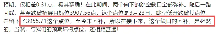 记:知行合一!选中标的,即使涨得再好,没有买,也是枉然。买入合适的标的,没有表现出来,要么是时机未到,要么就是选错了标的!敬畏市场,勿忘初心!多思考,少抱怨!杜绝马后炮!中线股重仓,短线股轻仓!短线追求热点,让利益最大化;中线稳中求进,让利润奔跑!指数一反昨日萎靡之态,高开高走,强势反弹,最高探至3955.94点,恰好补了3月23日跳空低开3955.71的缺口。3月30日晚间《行情能否再冲4000点?从短周期剖析未来行情的走势!》一文中,就明确提到了这个缺口必然回补,仅仅只用了两个交易日,并且昨天指数可是一根光脚的中阴线。关于后期走势,其实在3月30日的文中,通过60分钟的K线级别,就已做过探讨,并且已经给出了明确的点位,不清楚具体点位的,可以去翻阅一下之前的文章即可。而今天,是在相关的点位中,再做一个细致的补充!首先,明确一点,点位的达至,多数情况下并不能一蹴而就!关于这点,很多人都明白,对于行情其实各自都有其心里的预期,而预期并不会立马能够达成,而是经过拉升,回调,再拉升这种复杂的“N”字结构,最终达成,有的级别看的高的,甚至可以是漫长的过程。而同样,在现阶段,达至3994,甚至是4000这个点位,也非一蹴而就,而是需要一个震荡上扬的过程。在3月30日,明确表达过未来行情的走势,而在3月31日,也就是昨日,指数回踩,最后探到了3891.86点,昨天回踩,很多投资者又开始担忧,今天行情上扬,又开始充满信心,很大的一部分散户投资者会随着行情的剧烈波动,而大喜大忧。其实,只要确定了之后行情的方向,中间的波动,震荡,担忧大可不必!其次,在震荡过程中,把级别看的更低,有很多的点位,就会看的很明白,这也是我们今天做一个补充说明的原因所在!当然,小级别多数情况下用不到,除非盘中有 大把的时间看盘,以及能够找出相关的确定性点位。昨天指数最高探至3948.81点,自3月26日形成的阶段性高点3937.10点,这一结构形成的两个点位,一是折返点3889.04点,二是收缩目标位3896.27点,形成共振,而昨天的低点3891.86点,恰好在这共振区间内。这短期内的共振,直接说的结论,不做重点探讨。在新的小级别结构中,形成结构共振点,3987.11-3988.58,所以在接下来,可能先探至3988点附近,之后再回补今天的跳空缺口3919.82点,再次反弹3994点,甚至摸到4000点。先补缺口,再反弹,也有可能。结构就是这样,始终存在而通常不可见,结构的发现可悟可求,得看在行情中是否花精力和时间去研究和专注。结构上,把级别放大和缩小,揉碎了,点位看得都很清晰,接下来,先验证3988点附近。