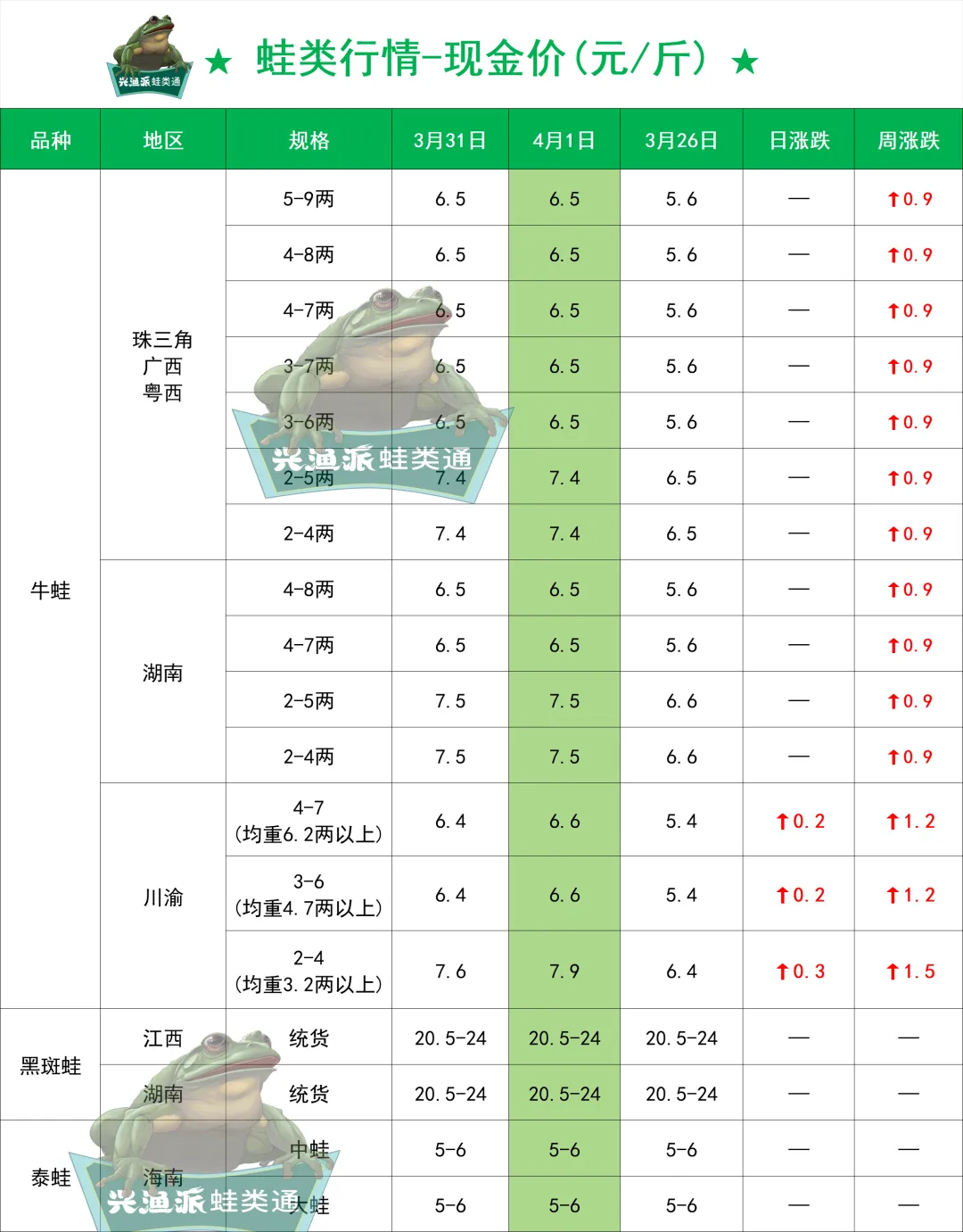 4月2日全国牛蛙、黑斑蛙、泰蛙最新行情!