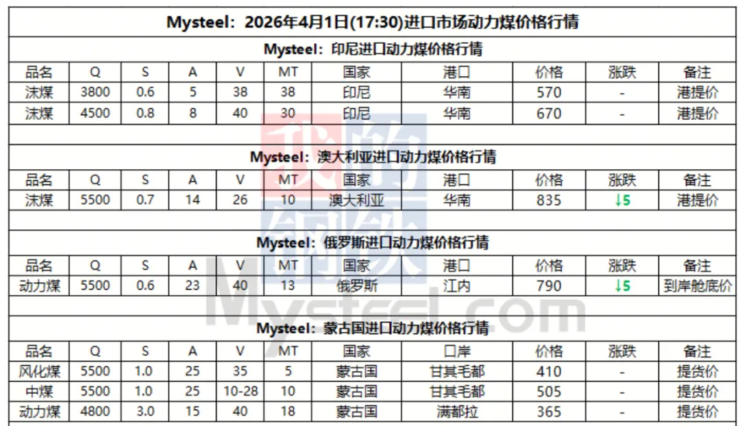 1日进口市场动力煤暂稳运行,国际市场,虽国际煤炭海运费出现小幅回落,但印尼矿方挺价情绪偏强,当前中低卡煤货盘回国成本仍偏高位运行;俄罗斯及澳洲等进口高卡煤矿山受国际市场采购需求支撑,因对短期煤价持乐观预期,现阶段远期现货报价持续坚挺。现Q3800印尼煤大船FOB主流报价多在62-63美元/吨,Q5500澳煤大船FOB主流报价集中在88-89美元/吨,Q5500俄煤大船CFR报价多在97美元/吨。国内市场中,沿海电厂陆续释放远月进口煤采购需求,贸易商在采购成本压力下投标重心小幅上移,市场整体交投氛围稍显僵持。预计短期内进口煤价延续稳中偏强态势,后续需关注运费波动及电厂实际拿货情况。价格方面, 现印尼Q3800报570元/吨,Q4500报670元/吨,澳煤Q5500报835元/吨,均为港提价;现俄煤Q5500报790元/吨,为到岸舱底价。
