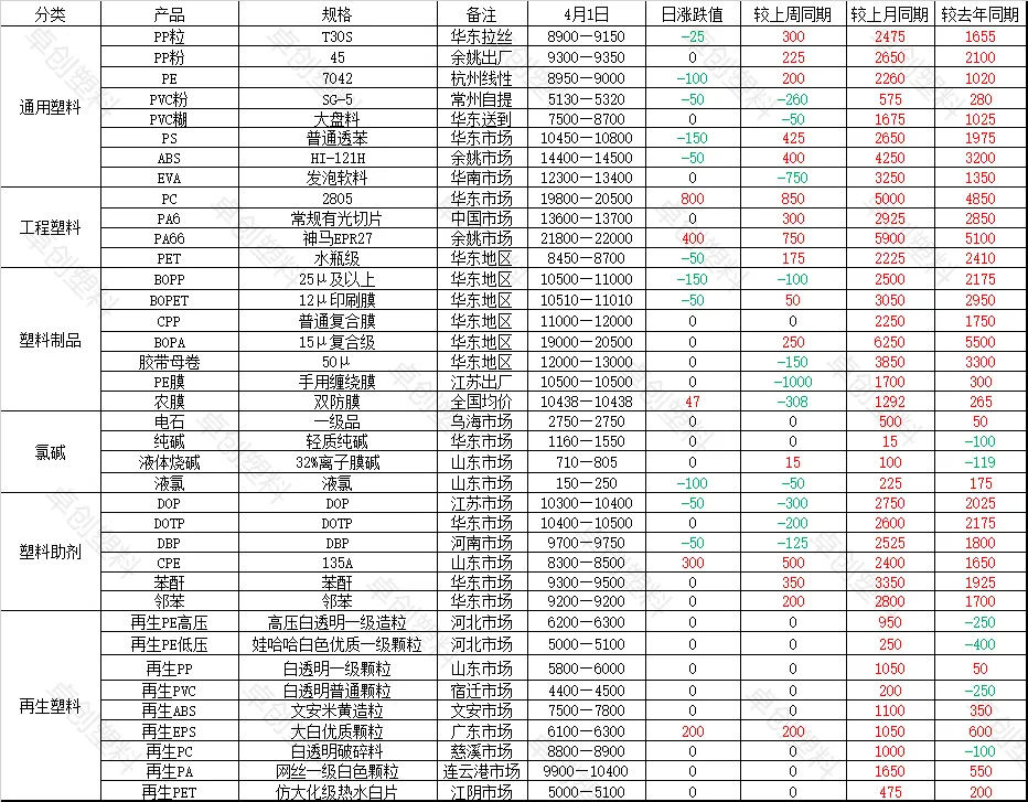语2026-04-01行情汇总及展望,PP粒下跌25、PP粉无浮动、PE下跌100、PVC粉下跌50、PVC糊无浮动。塑料每日收盘汇总