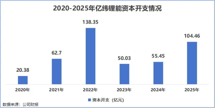 数据来看,2025年,亿纬锂能的资本开支达到了104.46亿元,同比大增88.38%。