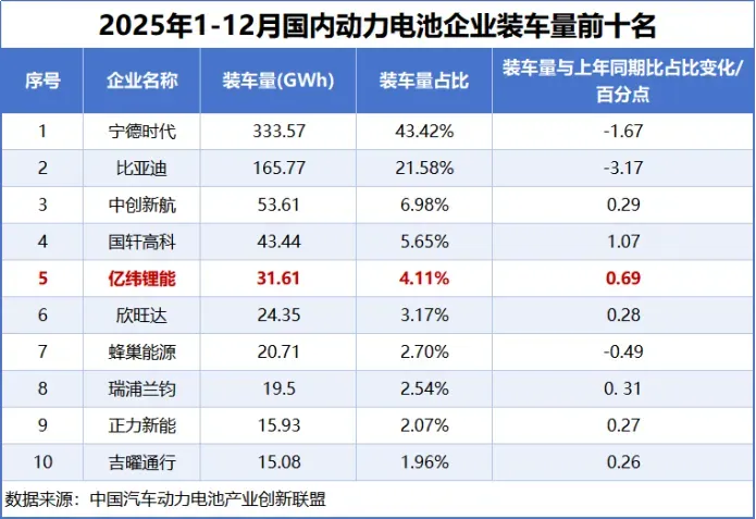 例如,2025年亿纬锂能的动力电池装车量为31.61GWh,体量仅为宁德时代的十分之一。