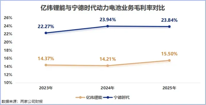 2025年,亿纬锂能“动力电池”业务的毛利率仅为15.50%,同期宁德时代“动力电池系统”业务的毛利率为23.84%。