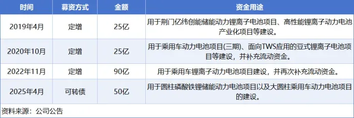 2019年以来,亿纬锂能通过定增、发行可转债等方式直接融资190亿元,资金普遍用于扩产项目。