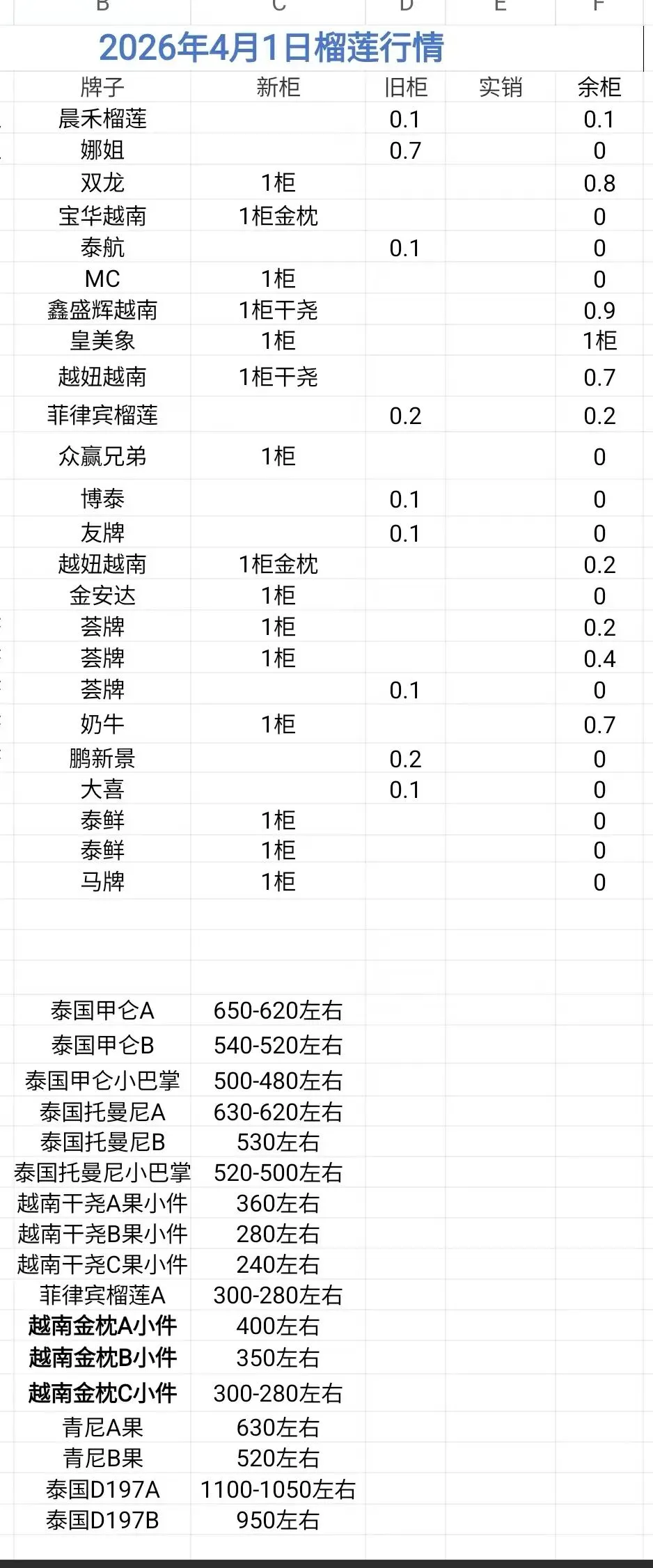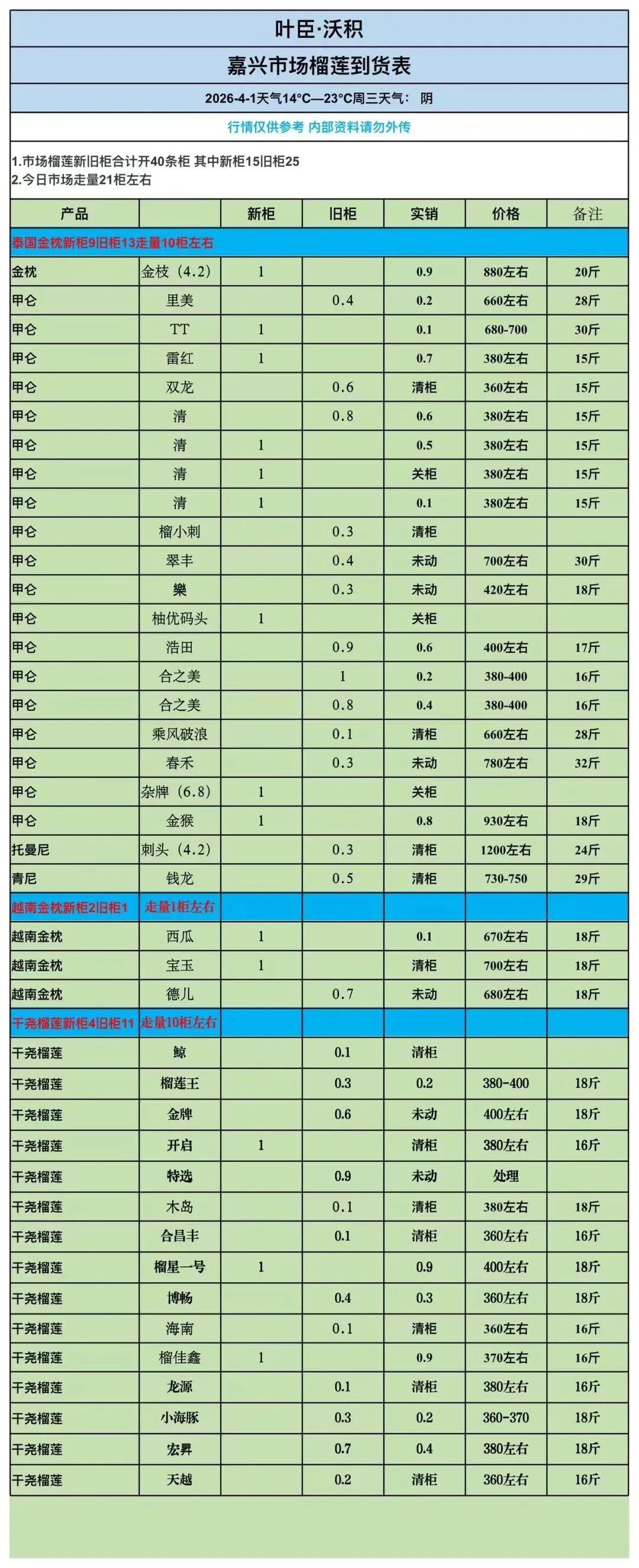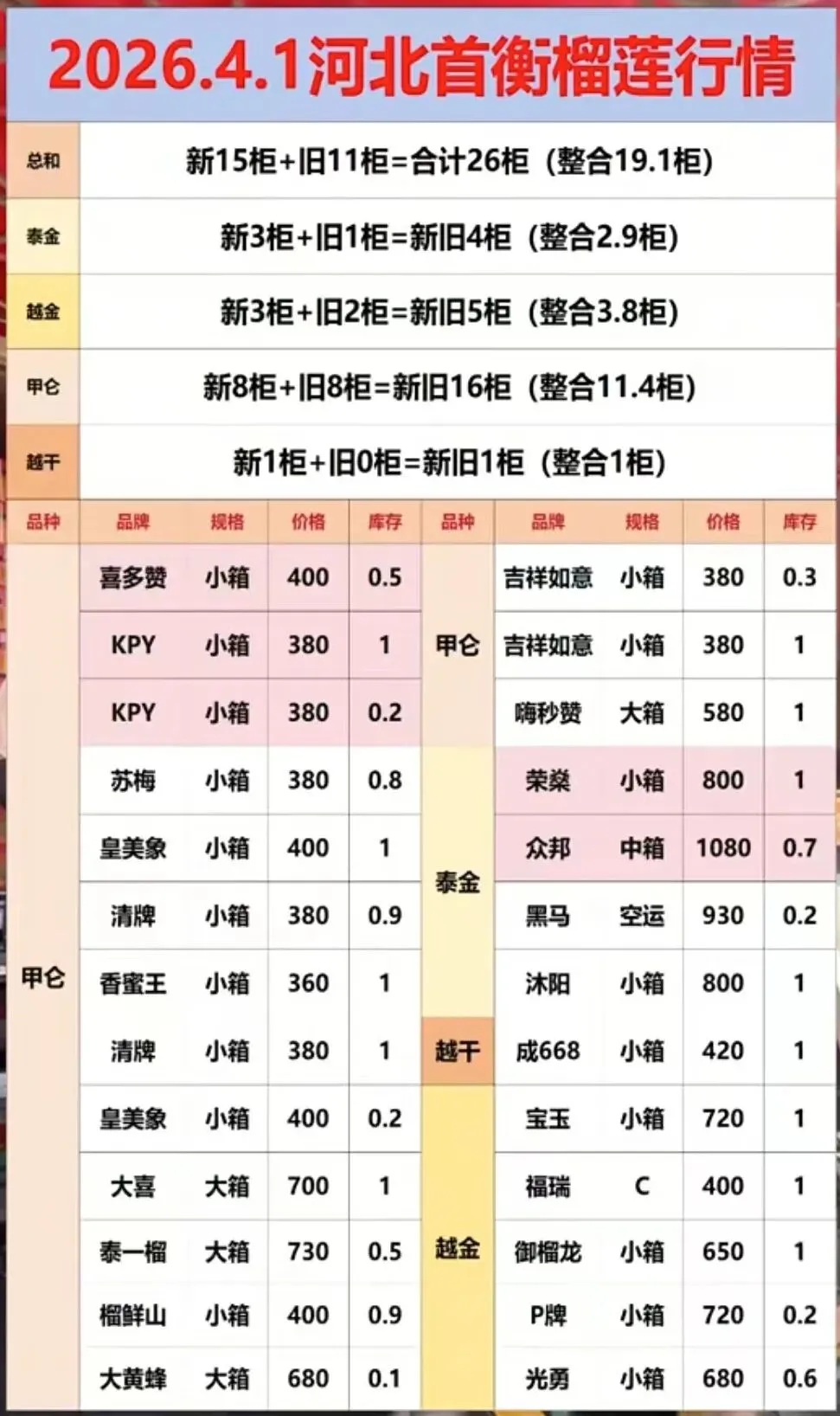 4月1号高碑店、嘉兴、昆明、榴莲行情