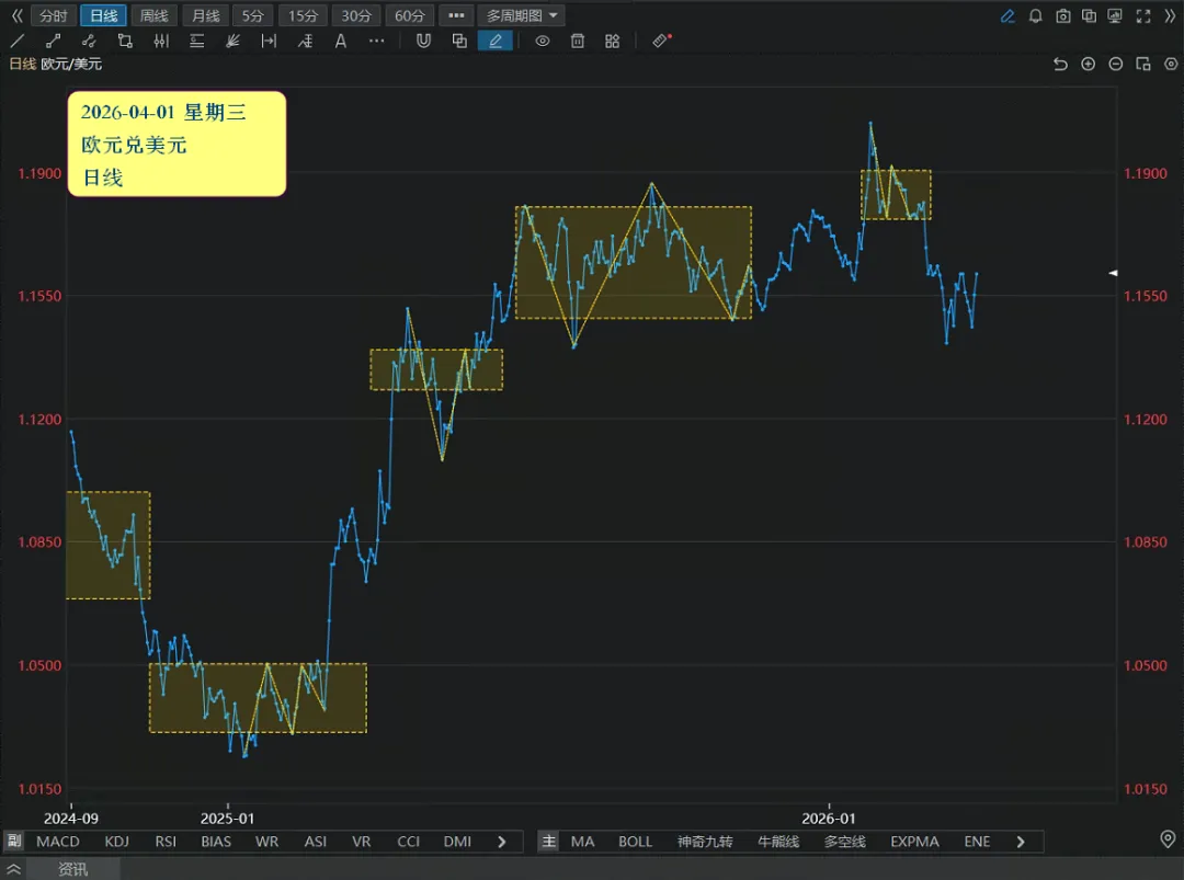 我是一个金融投资专家。rules 目录下面是我的策略的相关文件。分析: k/20260401_eurusd/kd.png 是日线k线图告诉我目前最近的一个平台的位置和趋势方向,直接出结果。