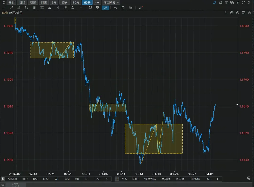 后续策略: 等待 60 分钟反弹至阻力位附近(1.1650-1.1700)形成顶部逆转形态后,再介入做空。