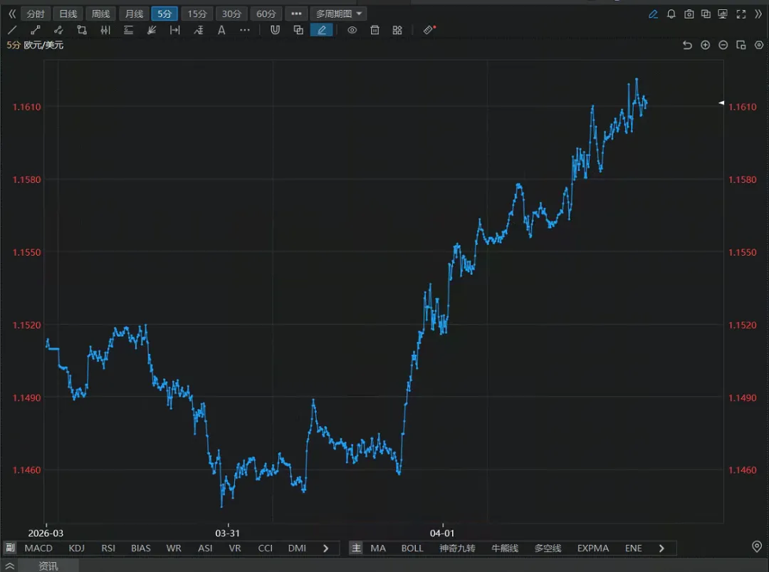 - 从 1.1450 附近持续反弹至 1.1610 附近