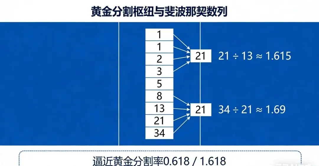 1. 数学上:完美的“黄金分割枢纽” 斐波那契数列:1, 1, 2, 3, 5, 8, 13, 21, 34...