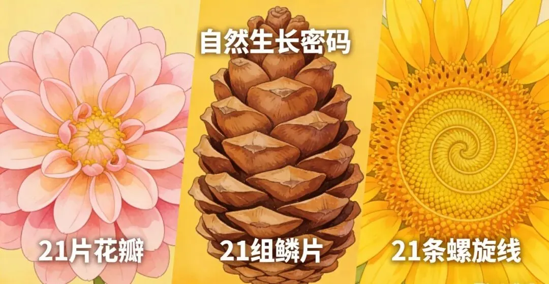 2. 自然与生命:21是“生长密码” 自然界最遵循斐波那契,而 21 是高频出现的终极数字: