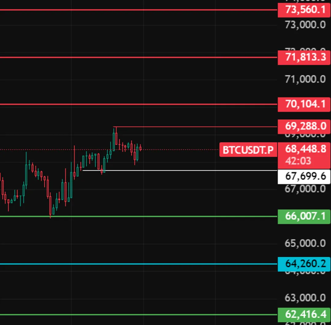 比特币晚上盯着67700这个位置就行。只要回踩不破,小级别就还能往上走,上面压力看70100、71800、73560这几个点。