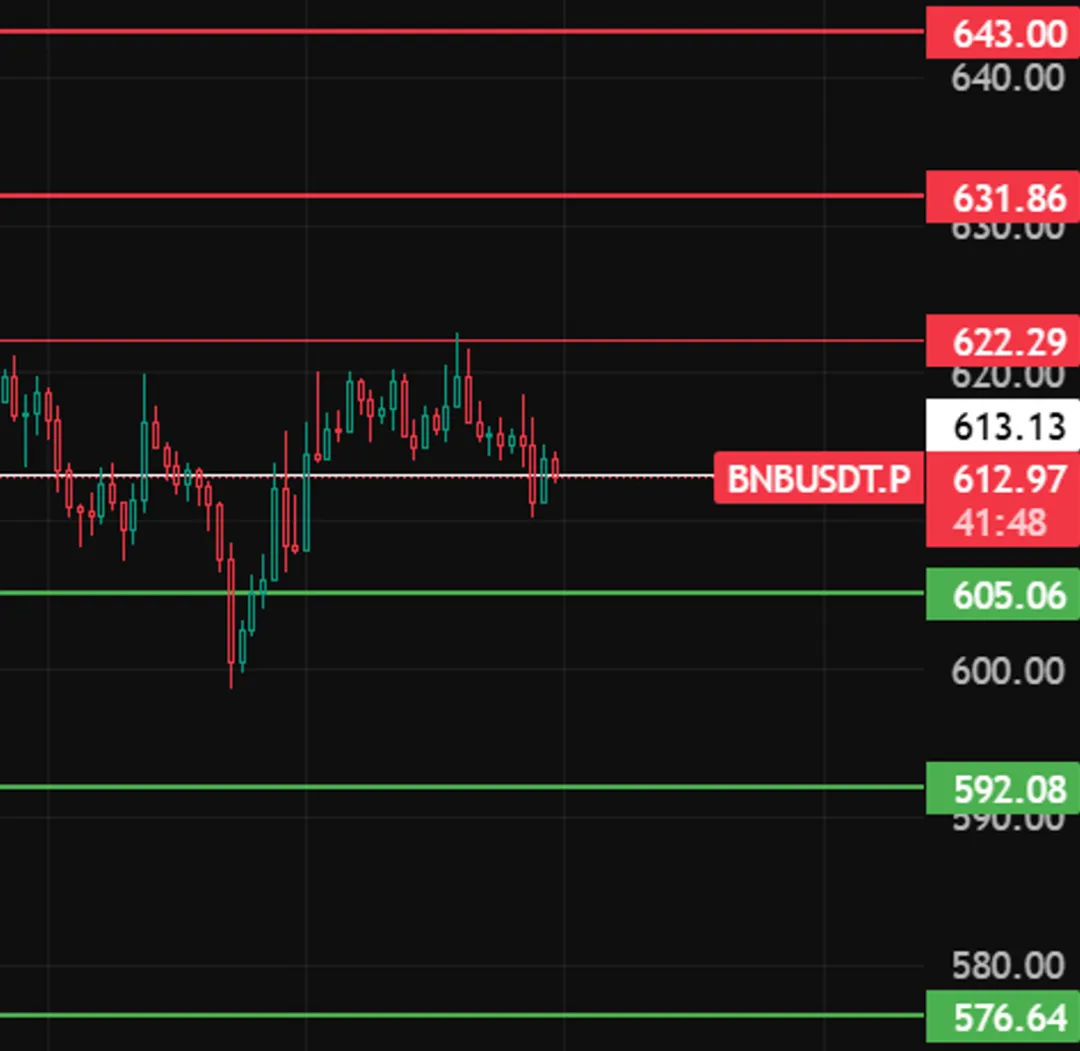 BNB晚上留意613这个点,只要回踩不破,4小时级别就继续走反弹,上面压力看622、631、643附近。