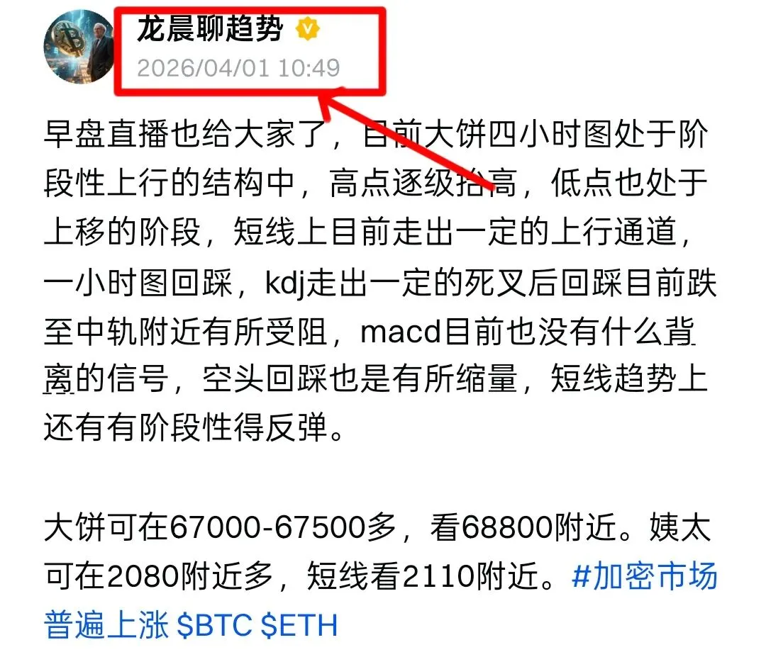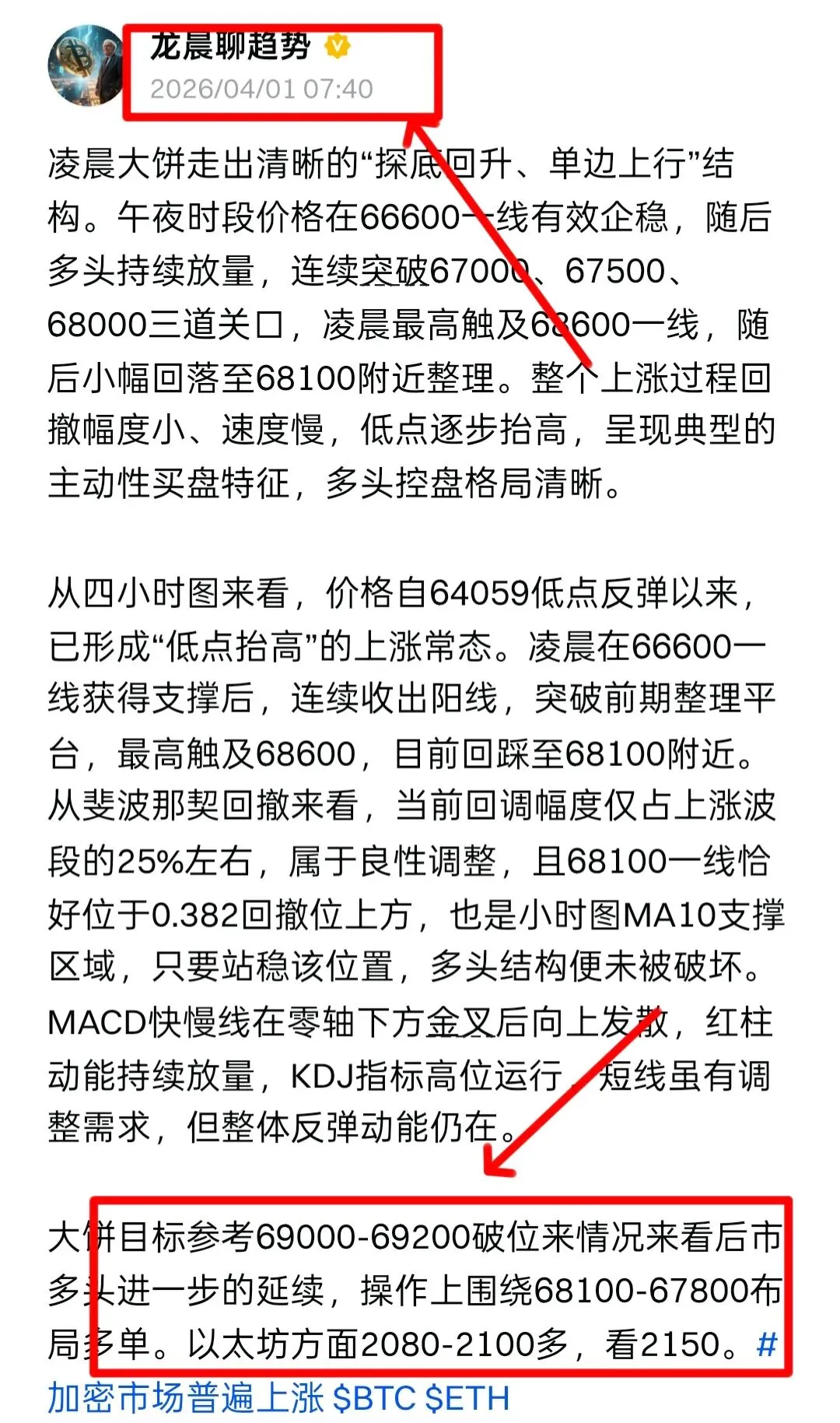 今日大饼整体走出“震荡上行、冲高整理”的走势。凌晨开盘后给到小幅回踩自67500一线企稳,随后稳步走高,早间突破68000关口,午后延续强势,最高触及69288一线,创出近期反弹新高,尾盘小幅回落至68700附近整理。全天呈现标准的上涨结构,低点从67357逐步抬高至68000上方,高点从68600突破至69288,回撤幅度小、速度慢,多头控盘特征明显。以太坊方面回踩最低给到2080一线止跌反弹,日内一度收复至关键阻力2150一线承压回落,随着阶段性回踩顶底转换于2110,目前再度收复至2150附近震荡。日内布局周三日内布局相对较少,均以波段为主,大饼总计落袋1700点,姨太落袋70余点空间。晚间布局多单依旧持有继续上看中。