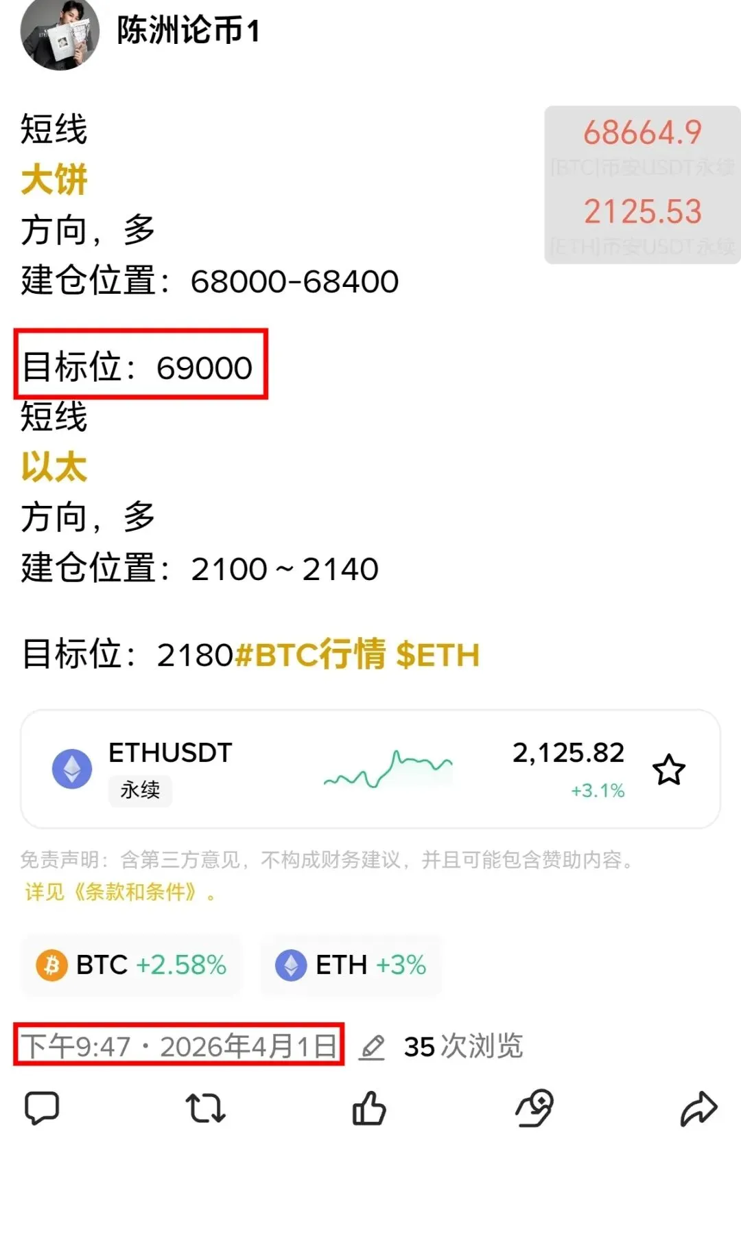 那么我们也是在4月1日晚间精准预判:大饼回踩布林中轨企稳,低点逐步抬高、量能温和放大,属于典型上涨中继洗盘,给出68000-68400的多单建仓区间,目标位69000,明确回踩就是上车机会。