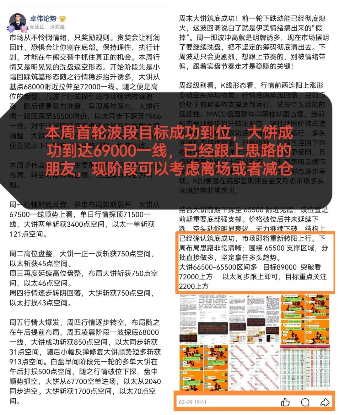 今日行情又是一如既往的多头老节奏,午夜阶段开始行情一路北上,多头强势出击,至午后阶段到达今日高点,大饼强拉2500点空间,到达高位69288一线,以太同步上涨至2158一线。随后行情进入回踩修复阶段,市场进入短期充能形态。这波反弹,卓伟已经提前明确提示,底部的吸筹区就给出明确分批进多思路,这波拉伸波段首要目标位也是成功到位。