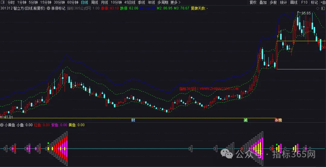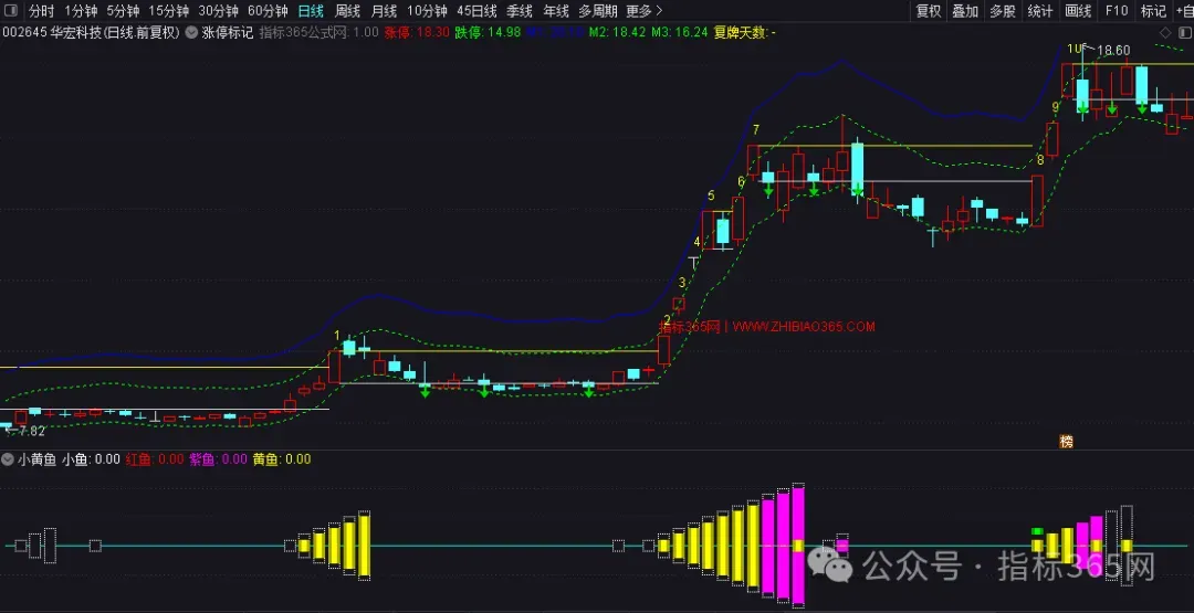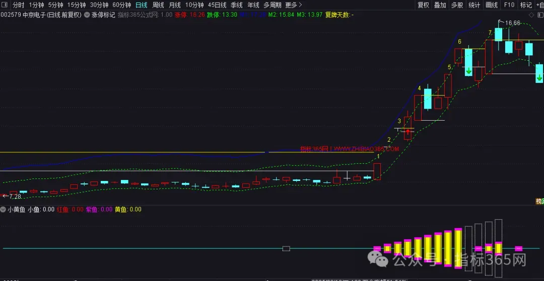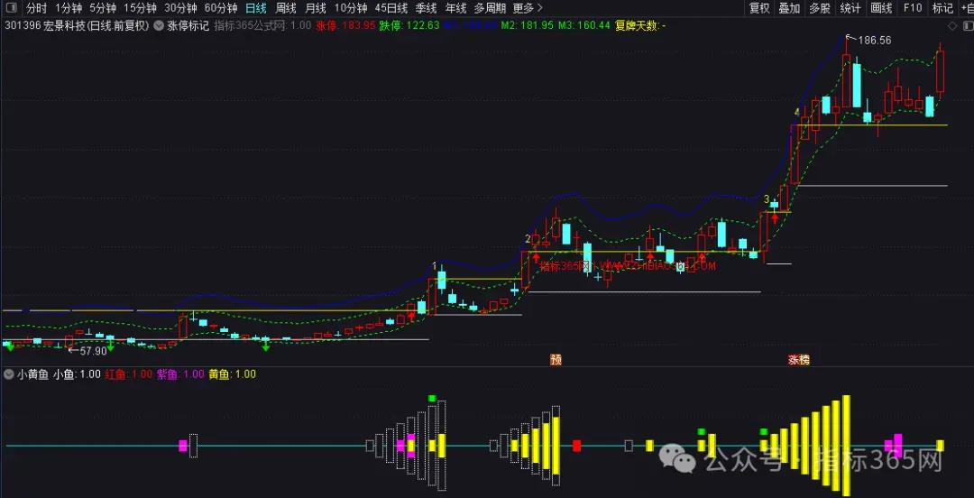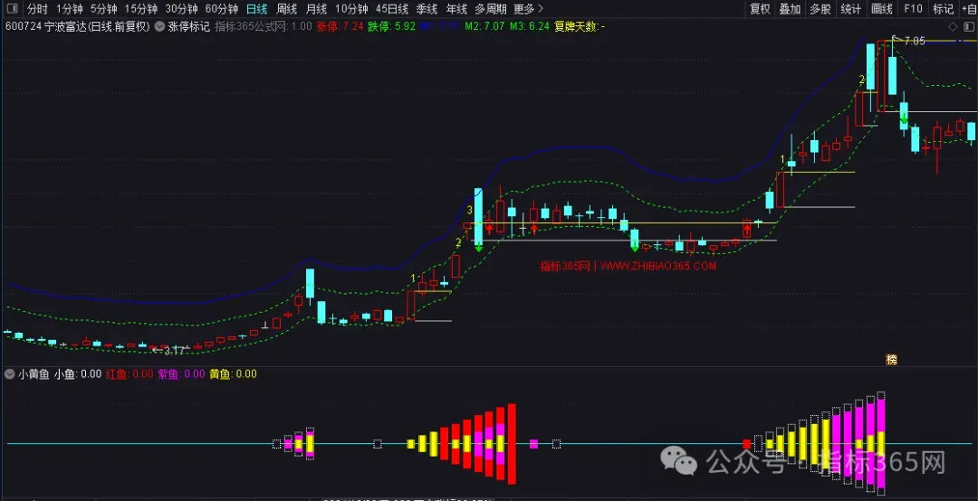 上图案例中,副图信号从小鱼→红鱼→紫鱼逐步递进,当黄色金条(金鱼)出现时,股价进入快速拉升阶段。主图同步显示涨停标记,买卖节奏一目了然。