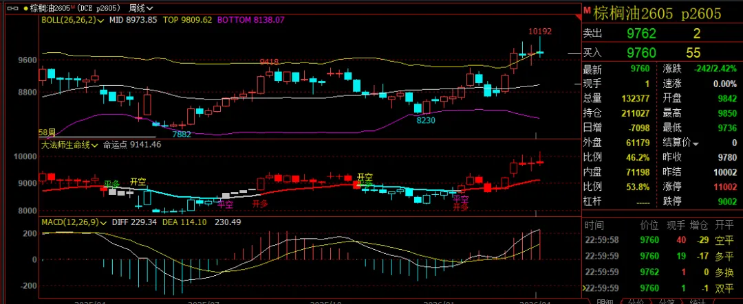 棕榈油期货跟随原油价格大幅上行,P2605合约从月初的9500元附近快速攀升至9800元一线,涨幅超过3%。