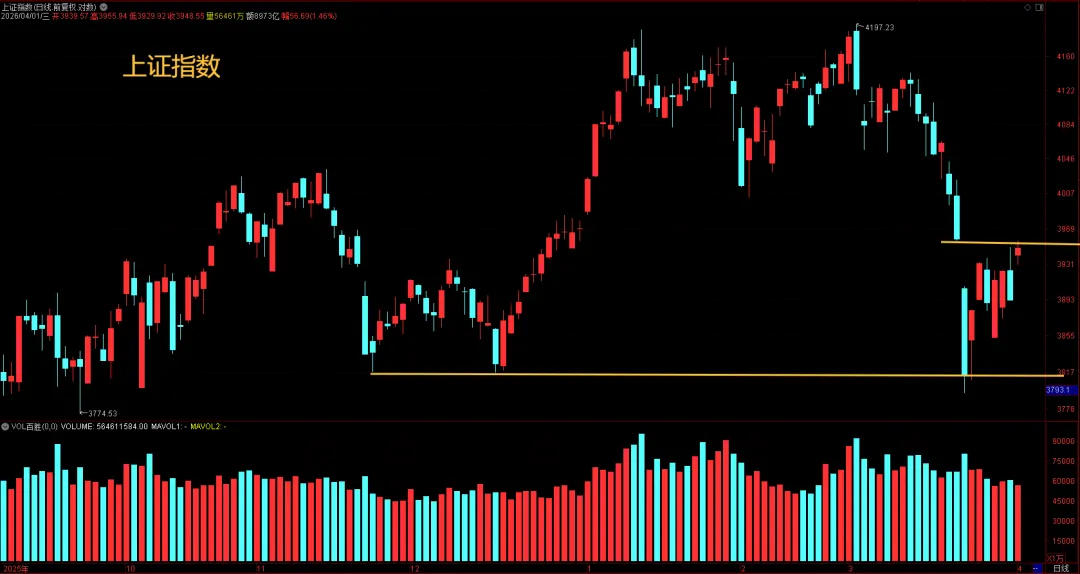 指数上,上证指数影线刚好回补3955点缺口,收于3948点,需要注意的是,指数涨的不错,但量能呈现缩量,说明大资金并没有行动,这里的上涨暂时定义为是反弹,舱位上不要太重,3月31日文章讲到,这次调整先走空间,后走时间,3月份下跌已经走完空间,4月份走时间概率较大,也就是震荡行情,4月机会要大于3月,若后面再调整收阴,不用太过于担心,市场要想正式启动,量能需要在2.5万亿。