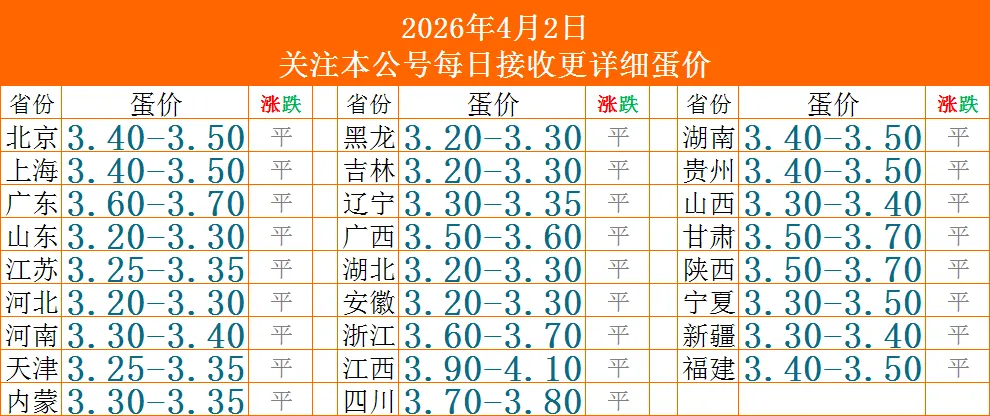 今日全国鸡蛋价格平稳运行,蛋价止跌回稳,蛋价维持在3.3–3.7元/斤,当前: 供应充足、走货平稳,以稳为主、局部小幅偏弱,短期(4 月上旬): 预计 窄幅震荡、稳中偏弱,难大涨大跌。