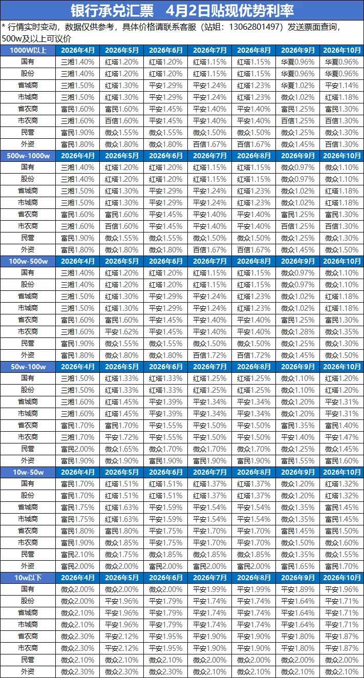 >『中能票据』4月2日票据贴现行情
