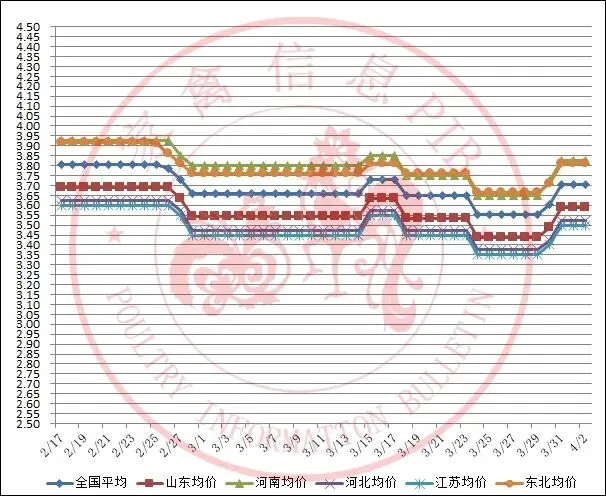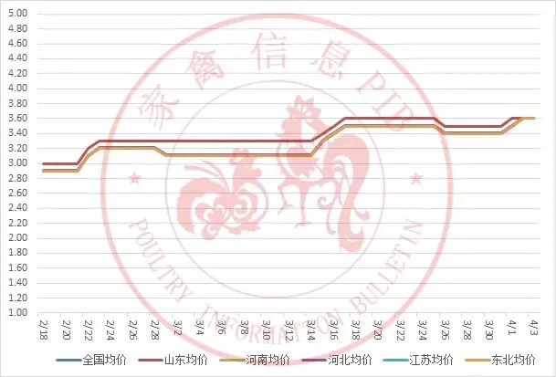 2026年2月18日-2026年4月3日主流地区白羽鸡鸡苗均价走势图