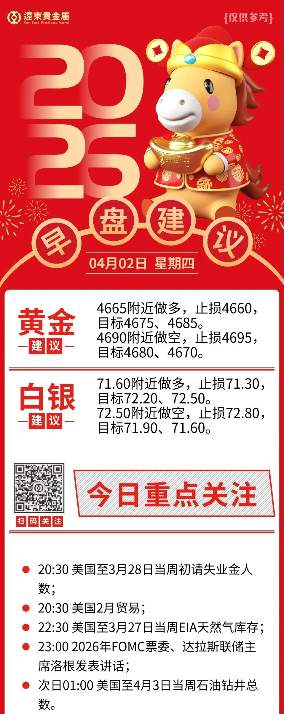 展望本交易日重点关注20:30 美国至3月28日当周初请失业金人数;美国2月贸易;22:30 美国至3月27日当周EIA天然气库存;23:00 2026年FOMC票委、达拉斯联储主席洛根发表讲话。综合来看,黄金短期内将继续受中东停火预期和美元走势驱动。如果特朗普讲话释放明确缓和信号,金价可能测试更高阻力;反之,若冲突延续或新袭击升级,避险需求将再度推升金价。长期而言,美联储政策转向、经济增长放缓预期,以及全球能源市场修复进程,将决定黄金是否能突破5000美元关口并站稳脚跟。总体而言,当前黄金市场正处于地缘政治缓和与宏观政策预期交织的敏感窗口。投资者需保持警惕,密切跟踪特朗普讲话、中东外交进展以及即将公布的美国就业和通胀数据。在不确定性仍存的背景下,黄金作为多元化配置工具的价值依然突出,但短期波动或将加剧。未来数日,市场风向或将决定这一波反弹能否演变为新一轮趋势性上涨。