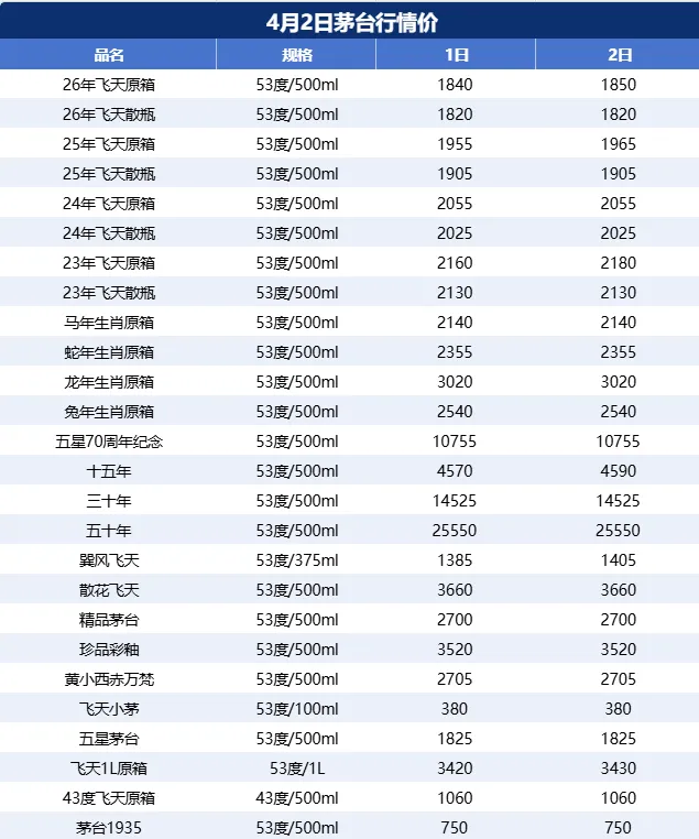 飞天茅台上涨!茅台酒4月2日行情价!每日持续更新茅台酒最新……